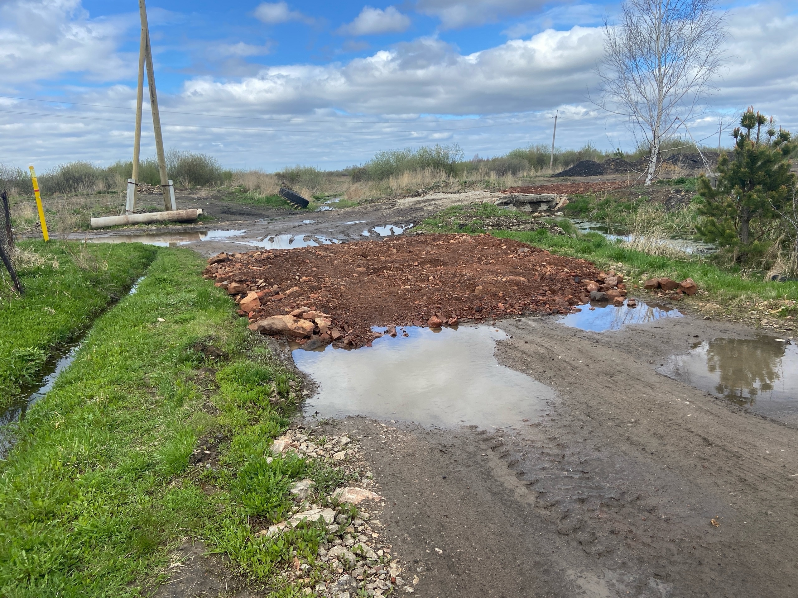 Этот строитель дома засыпал лужу так, что теперь по дороге не проехать на легковой машине от слова совсем. Путь здесь был в ужасном состоянии, а сейчас стал еще хуже.