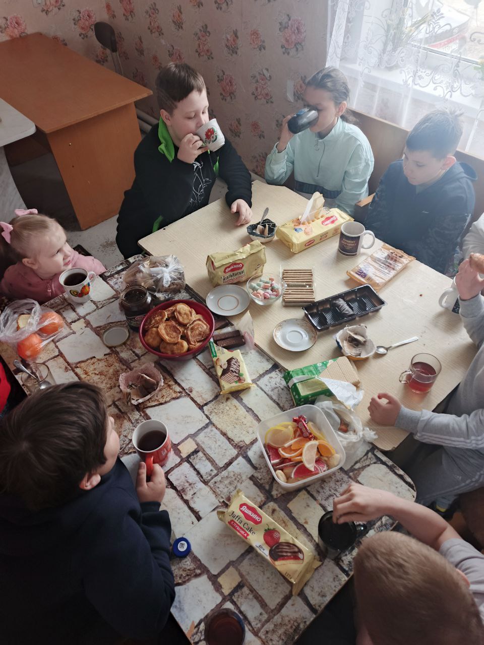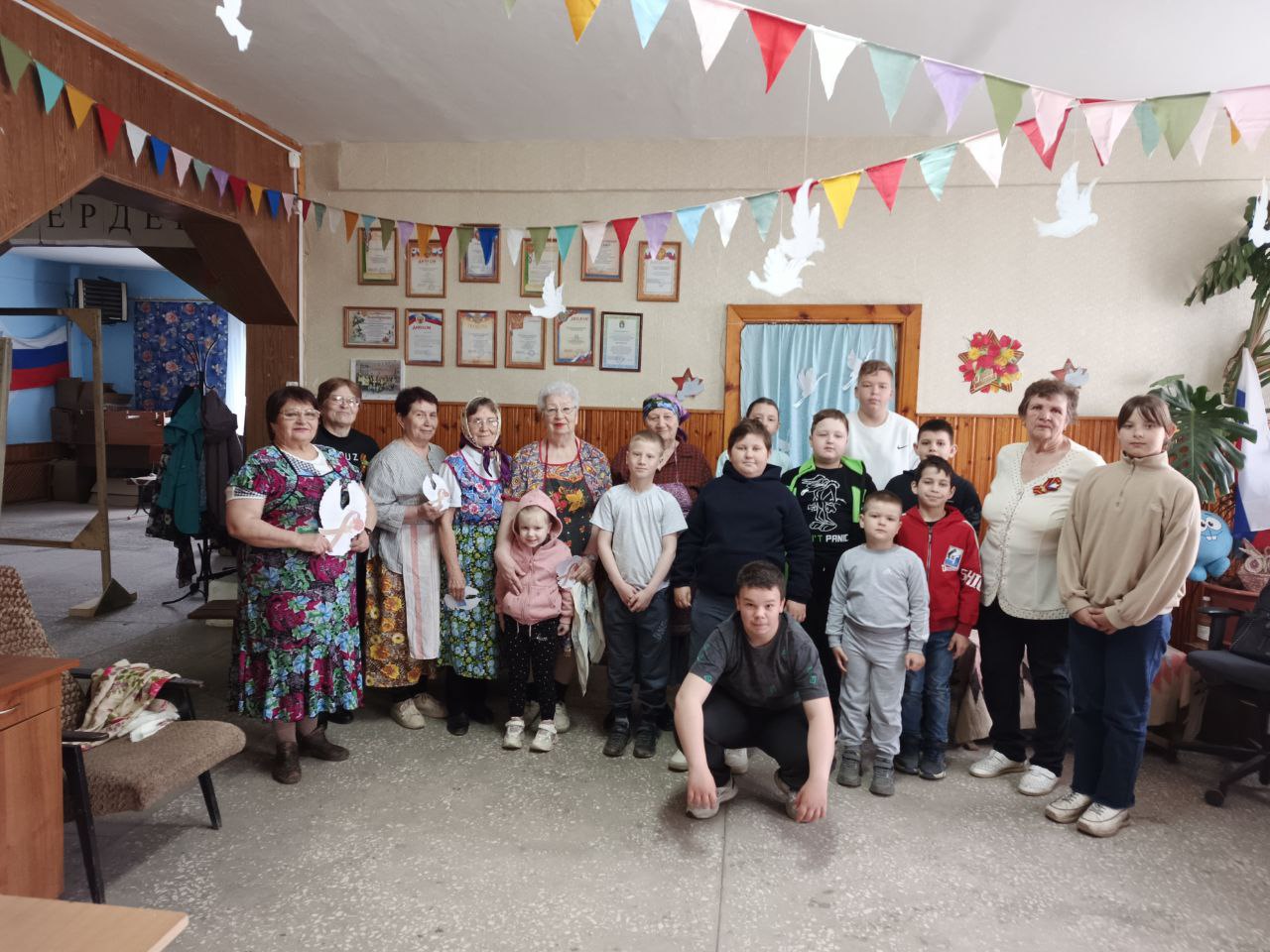 Мы с удовольствием посмотрели сценку «Бабья доля» и завершили праздник песней «День Победы», которую пели все вместе. Ребята поздравили ветеранов открытками «Голубь мира», а потом дружно за столом попили чай с угощением. Надежда Максимовна напекла оладьев с повидлом, родители организовали вкусняшки на стол.