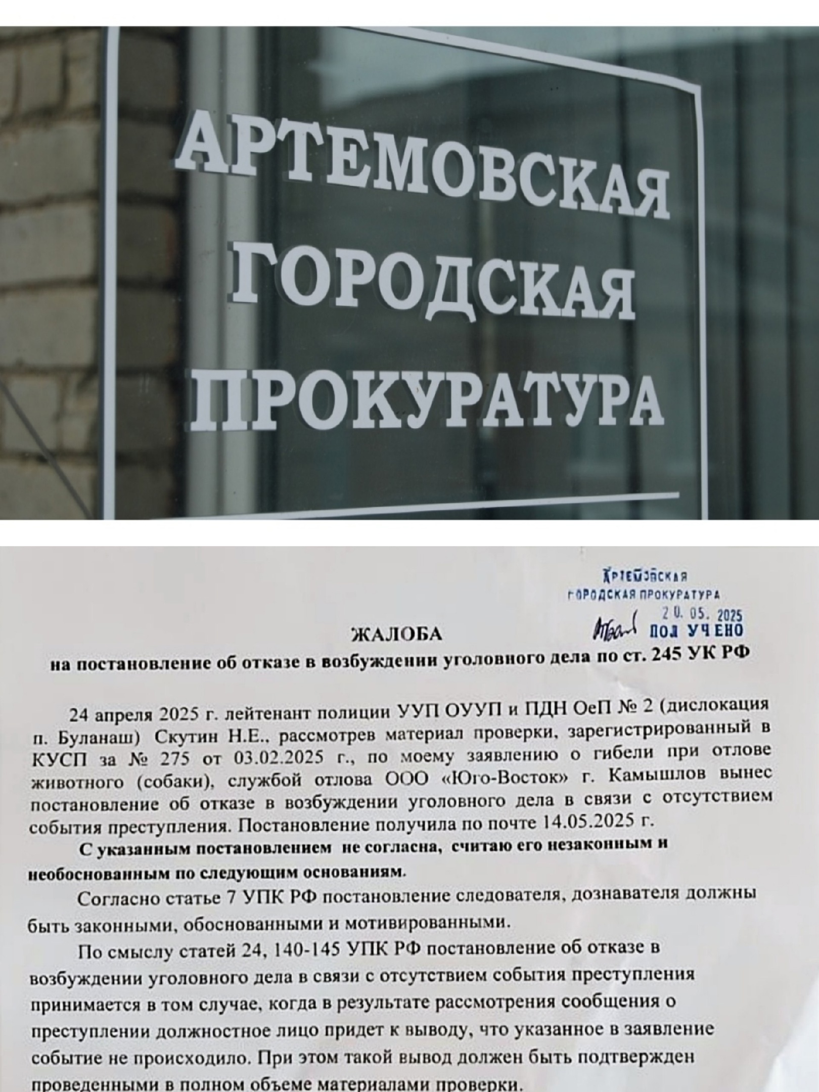 Н. Е. Скутин , "рассмотрев материалы проверки от03.02.2025 , установил… ". Да ничего он не установил. Безобразно, на наш взгляд, проведена проверка по факту убийства собаки, совершенного камышловским отловом. Руководство ОМВД России «Артемовский"прошу обратить внимание.