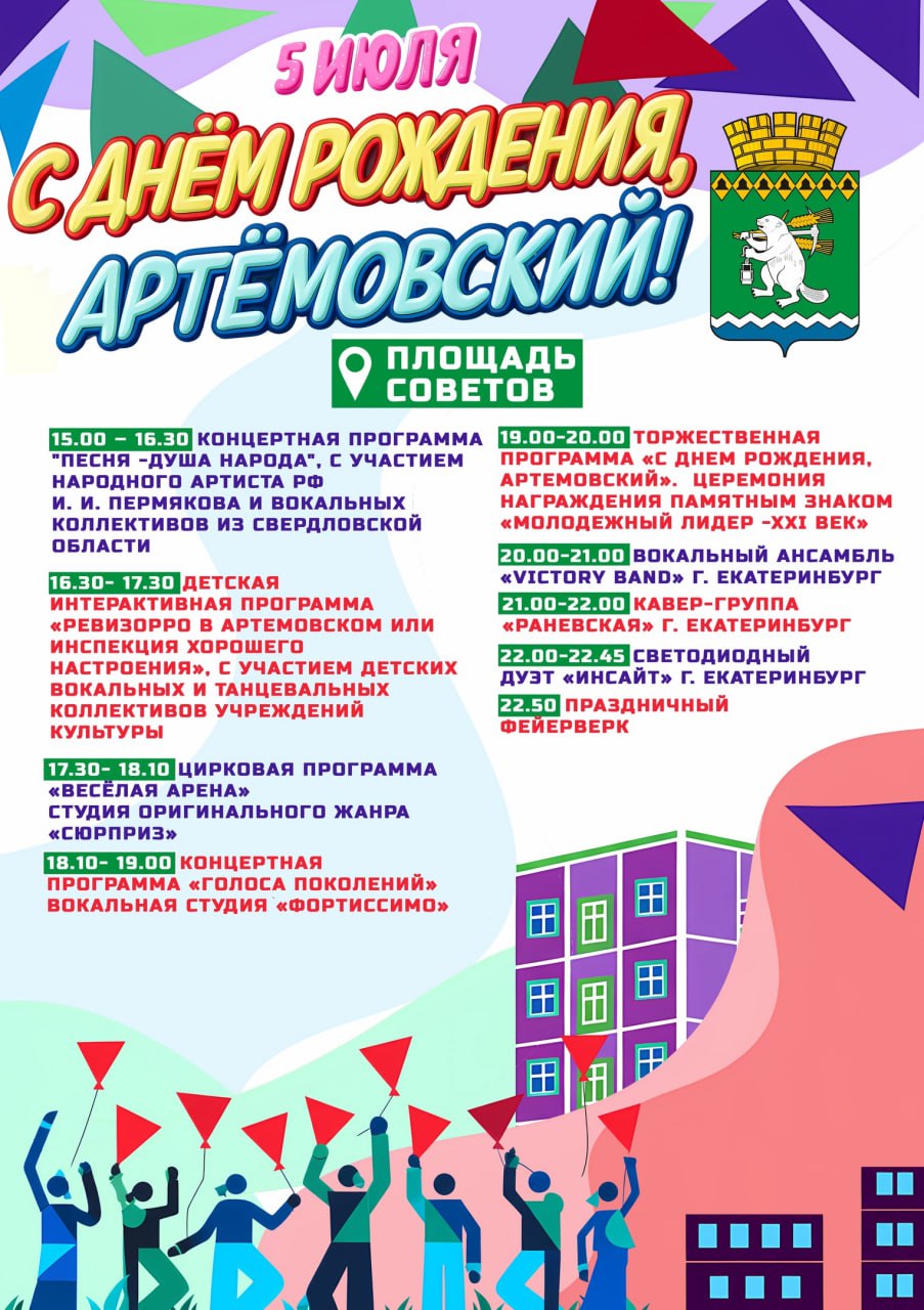 С 19:00 до 20:00 пройдет торжественная часть дня города с участием депутатов, Почетных граждан. Памятным знаком «Молодежный лидер — XXI век» и благодарностями наградят отличившихся артемовцев.