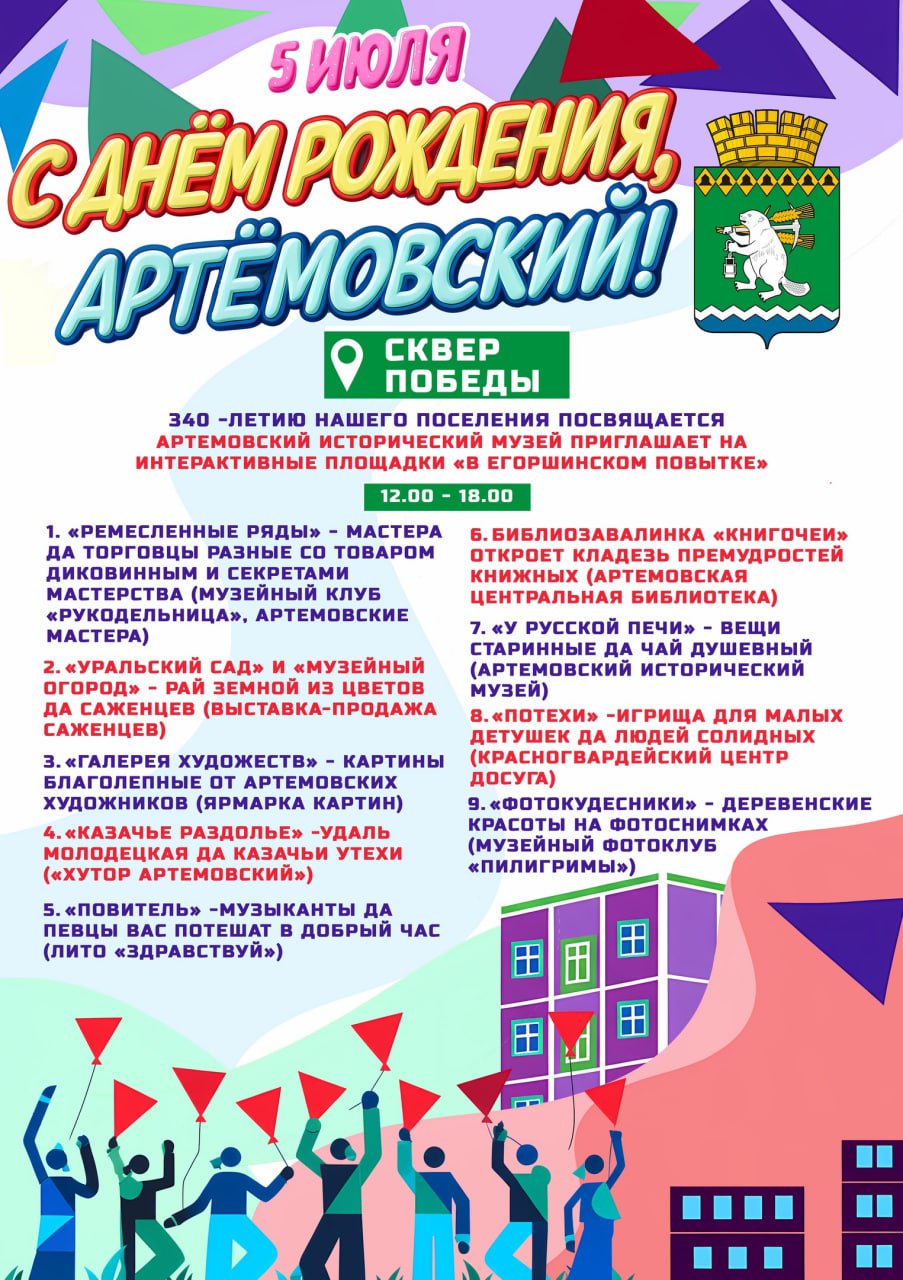 Также с 12:00 до 18:00 пройдет обширная стилизованная программа в сквере Победы под названием «В Егоршинском повытке», посвященная 340-летию поселения. В ней будут представлены ремесленные ряды и мастер-классы, наполненные уральским колоритом.