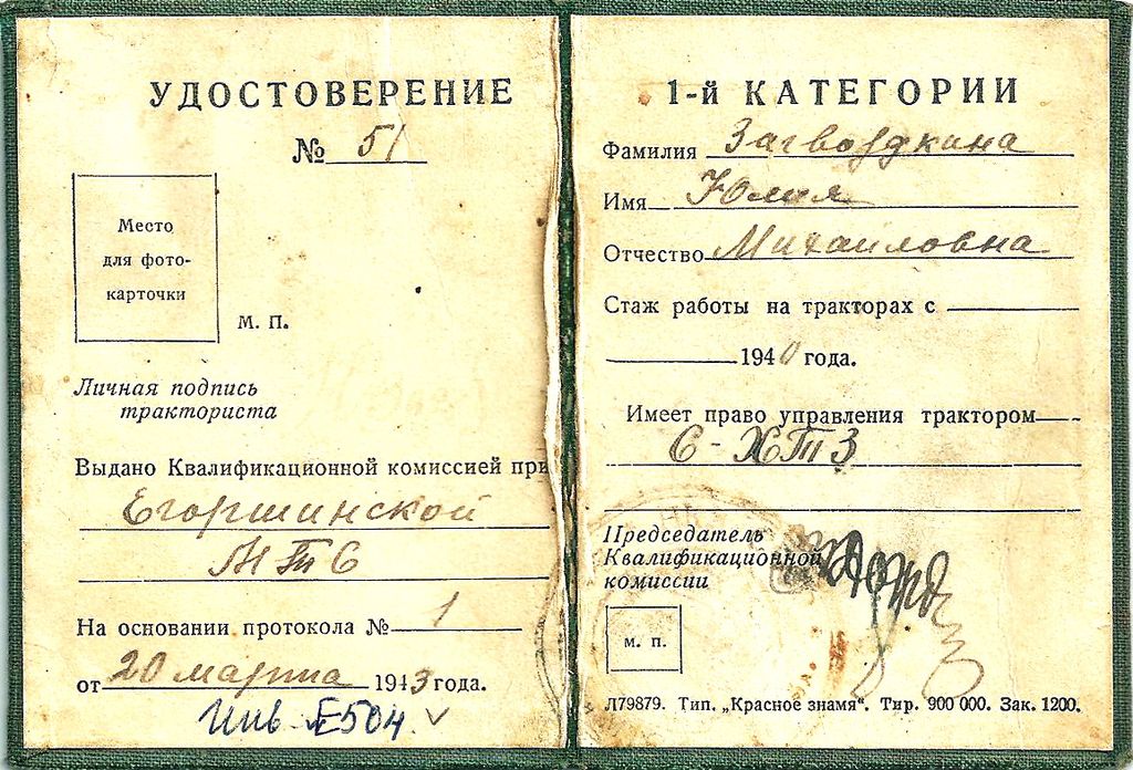 С большой отдачей сил и здоровья давались девушкам такие результаты. Вот строки из газетной статьи за 19 сентября 1946 года: «Не мешает ненастная погода выполнять нормы комбайнерам Налимову, Брылину и Загвоздкиной». «Знатная трактористка Юлия Загвоздкина выработала за сезон 400 га мягкой пахоты, сэкономив больше тонны горючего» На фото - Юлия Загвоздкина в молодости.