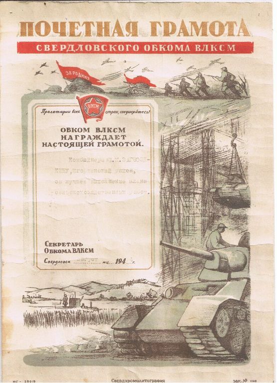 За отличную работу в 1942 году Юля и Катя Загвоздкины, Енфалия Беспамятных и Ольга Корелина получили почетные грамоты исполкома облсовета депутатов трудящихся. Сейчас эти замечательные девушки ремонтируют трактора. А Катя обучает трактористов на курсах и работает там секретарем комсомольской организации».