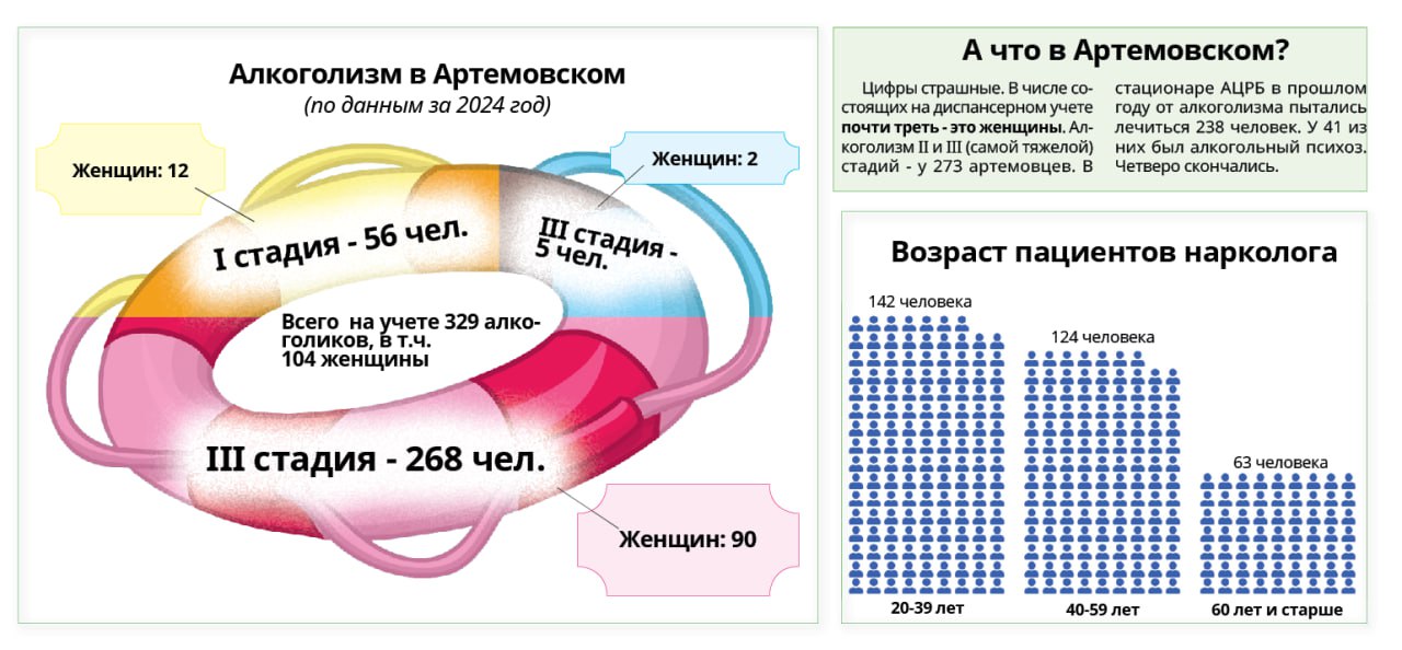 Цифры страшные. В числе состоящих на диспансерном учете почти треть — это женщины. Алкоголизм II и III (самой тяжелой) стадий — у 273 артемовцев. В стационаре АЦРБ в прошлом году от алкоголизма пытались лечиться 238 человек. У 41 из них был алкогольный психоз. Четверо скончались.