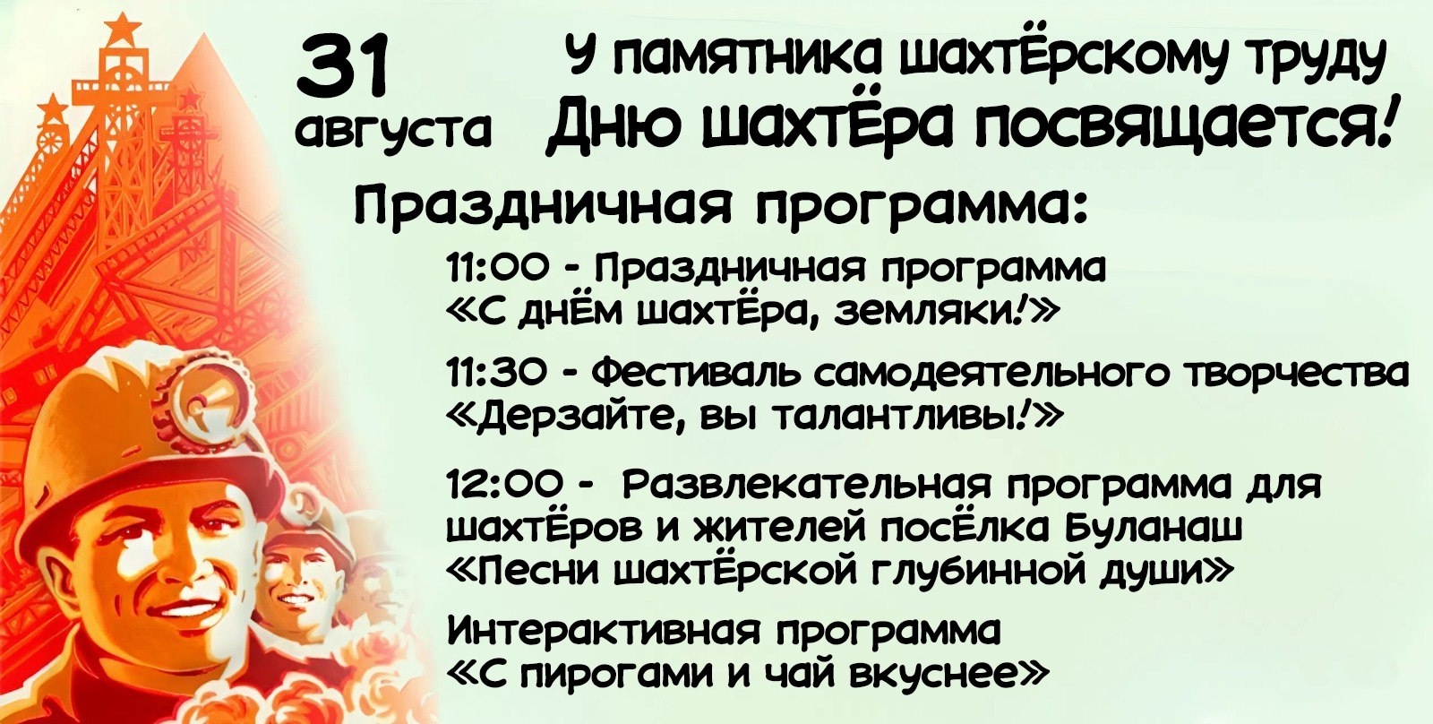 В Буланаше по традиции у Памятника шахтерскому труду 31 августа пройдет митинг, где прозвучат воспоминания о людях, составивших славу поселка, в минуту молчания вспомнят шахтеров, кто погиб при добыче угля, кого уже нет на этом свете.