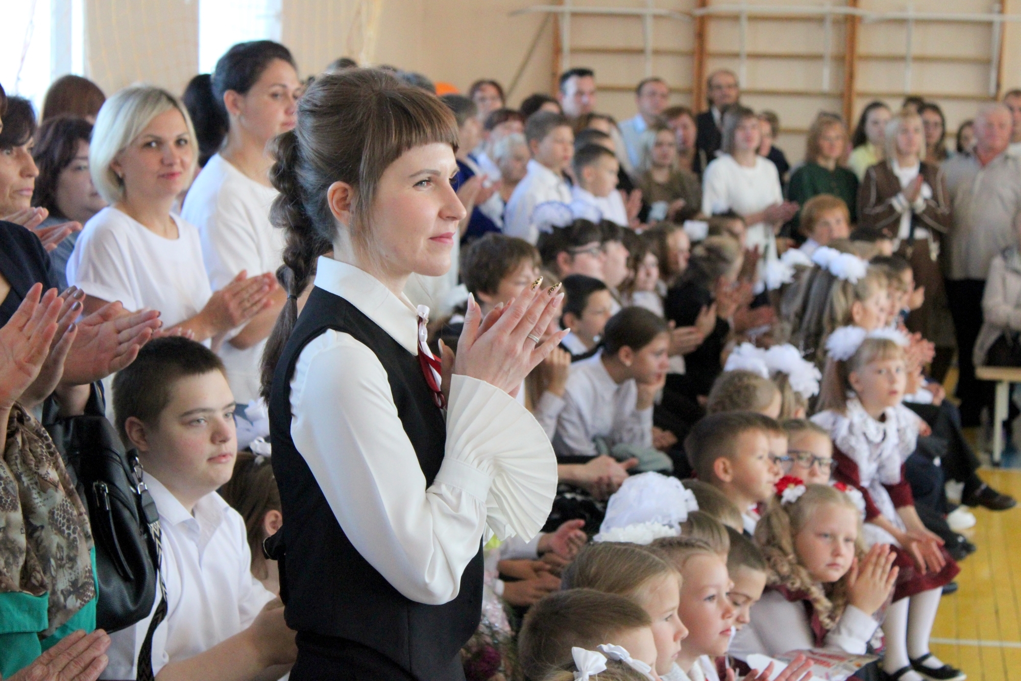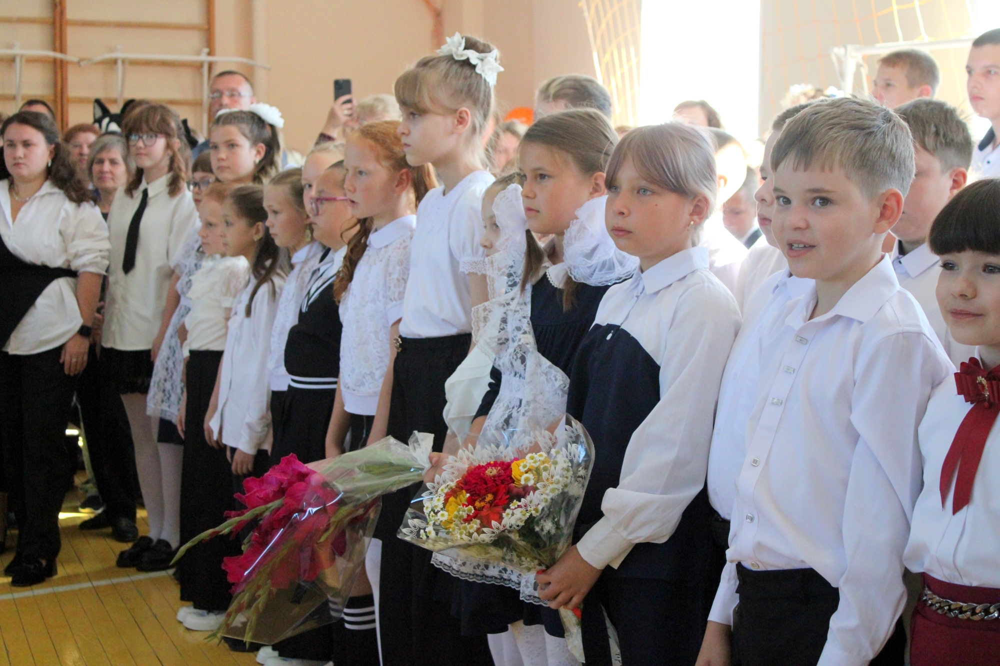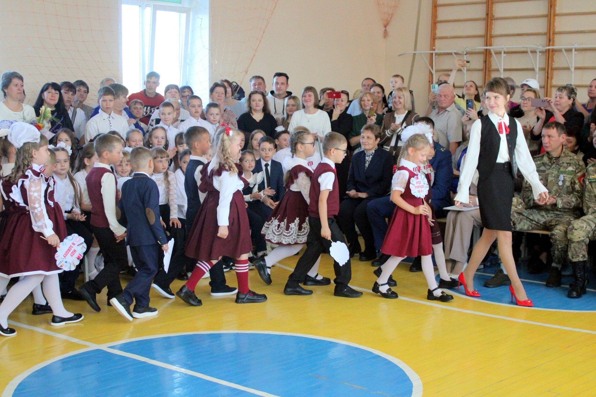 Спортивный зал школы, где проходила линейка, был полон — поздравить учеников покровчане пришли целыми семьями. Мамы, папы, бабушки — все с умилением смотрели на новых учеников — первоклассников, которым была посвящена праздничная линейка.