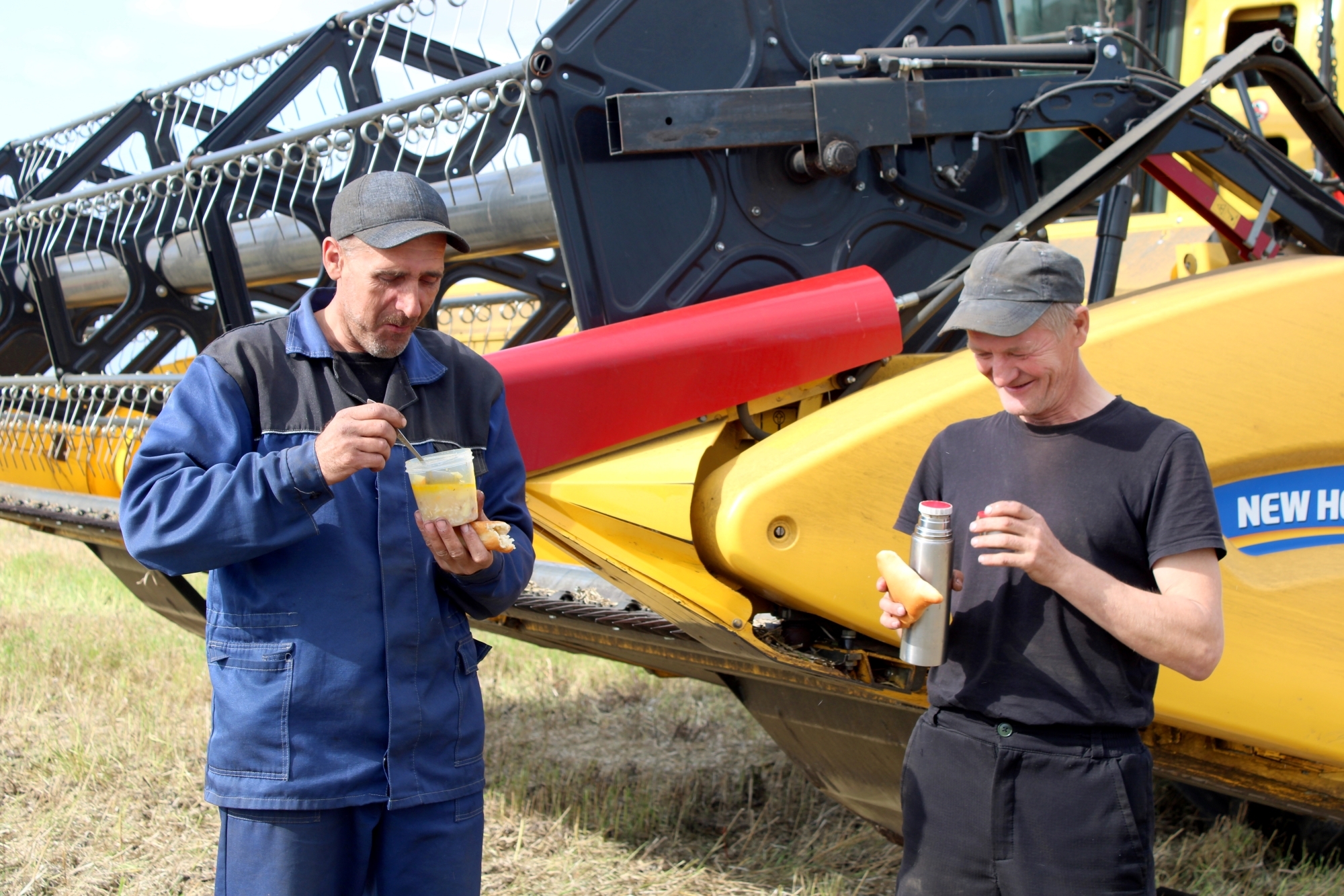 Руслан Шмаков, руководитель небольшого, в 9 человек, коллектива, назначил встречу у полей в Покровском в полдень, когда механизаторы и трактористы буквально на 15–20 минут прерывают работу, чтобы пообедать.