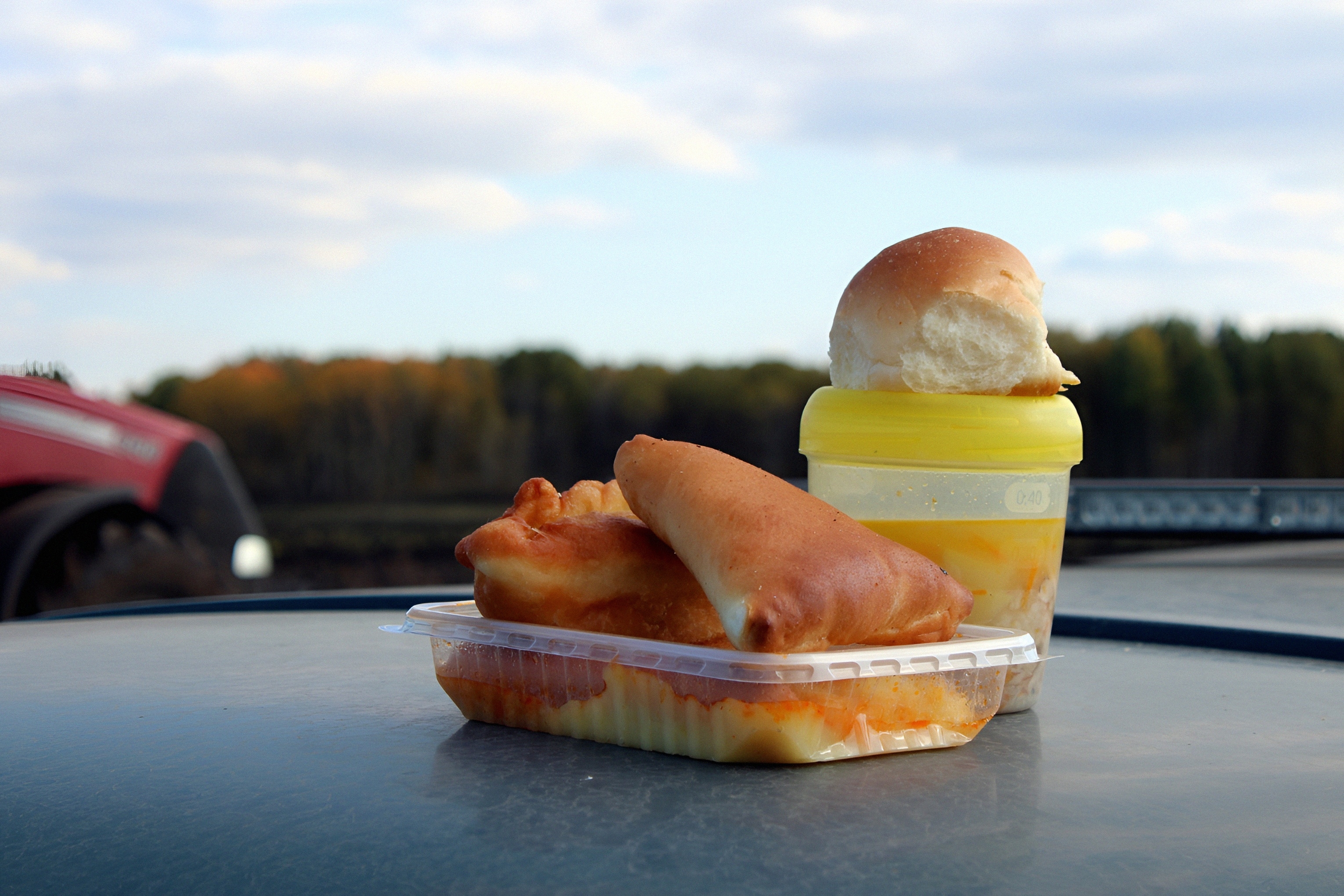 В день, кроме минутного перекура пока из бункера зерно пересыпается в КамАЗ, у рулевых есть пара коротких перерывов — на обед и еще ужин, если смена длинная. Кормит народ пельменная Покровского потребобщества. Вот и мы с Русланом Николаевичем привезли работникам обед куриный суп, пюре с котлетой, расстегай и хлебные булочки.