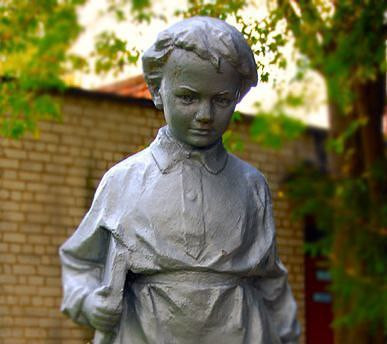 Прибежав в детский сад, он увидел настоящую картину соцреализма: «Под сенью кустов сирени и трели соловья встречают рассвет два ребенка. Лохматая девочка с расческой и лентами в руках и маленький кудрявый мальчик с книжкой из бронзы — Володя».