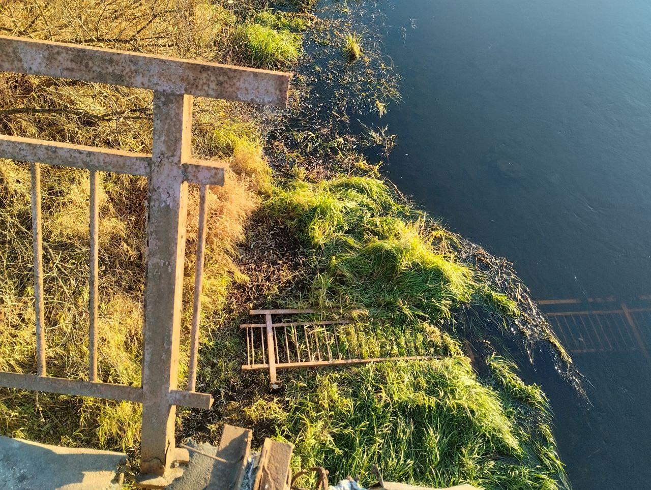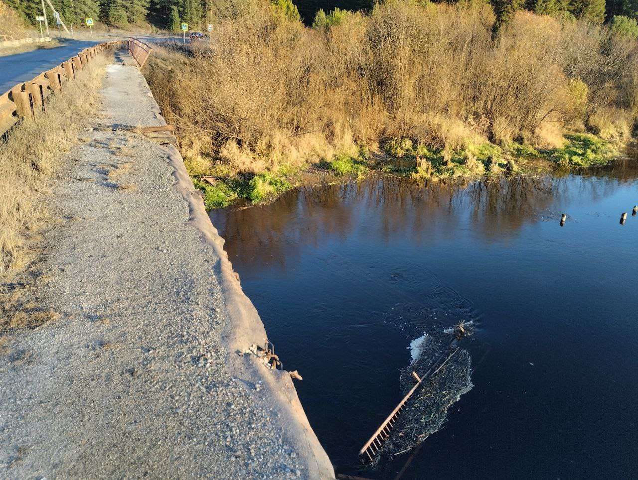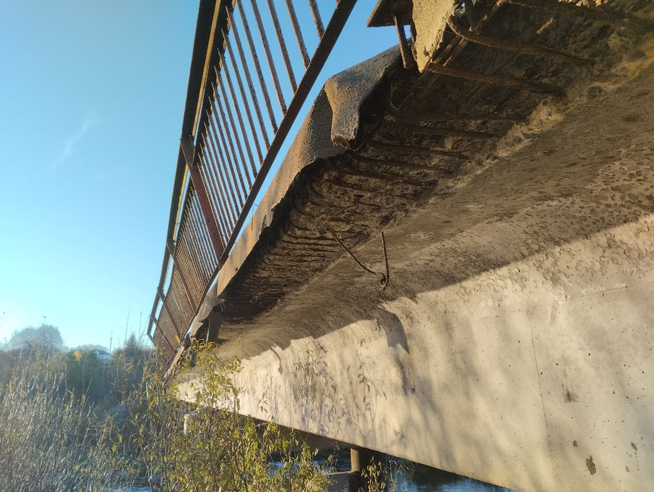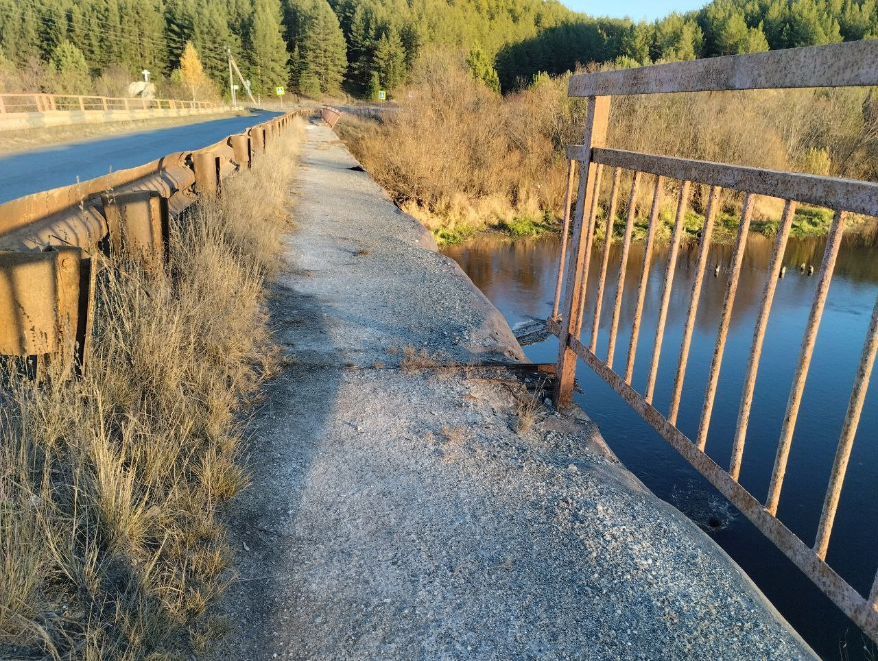 Две недели назад в реку упали металлические перила ограждения пешеходной дорожки. Арматура, на которой они держались, сгнила. Теперь часть пешеходной части моста - без защиты.