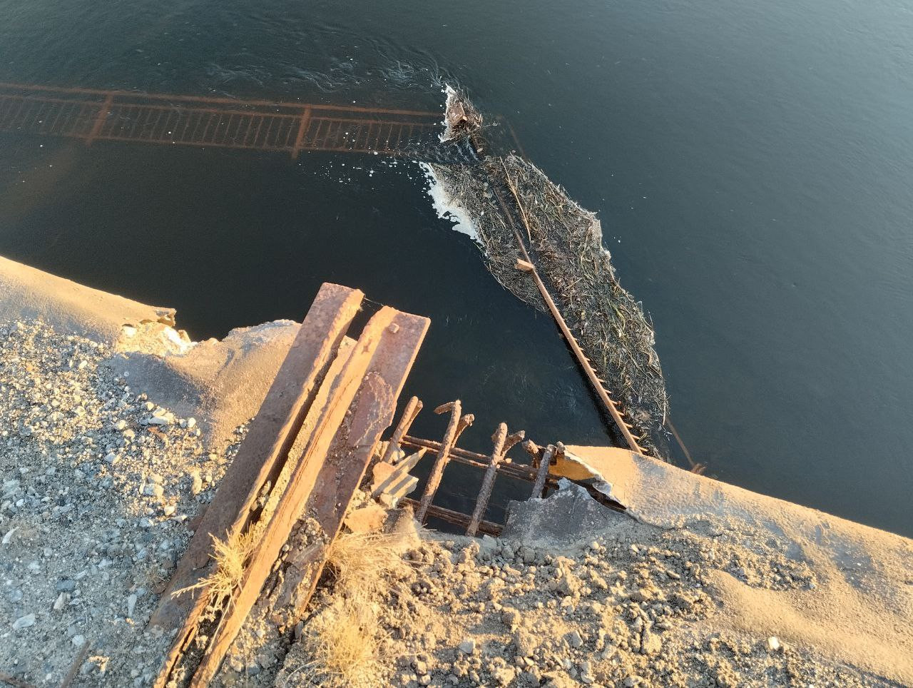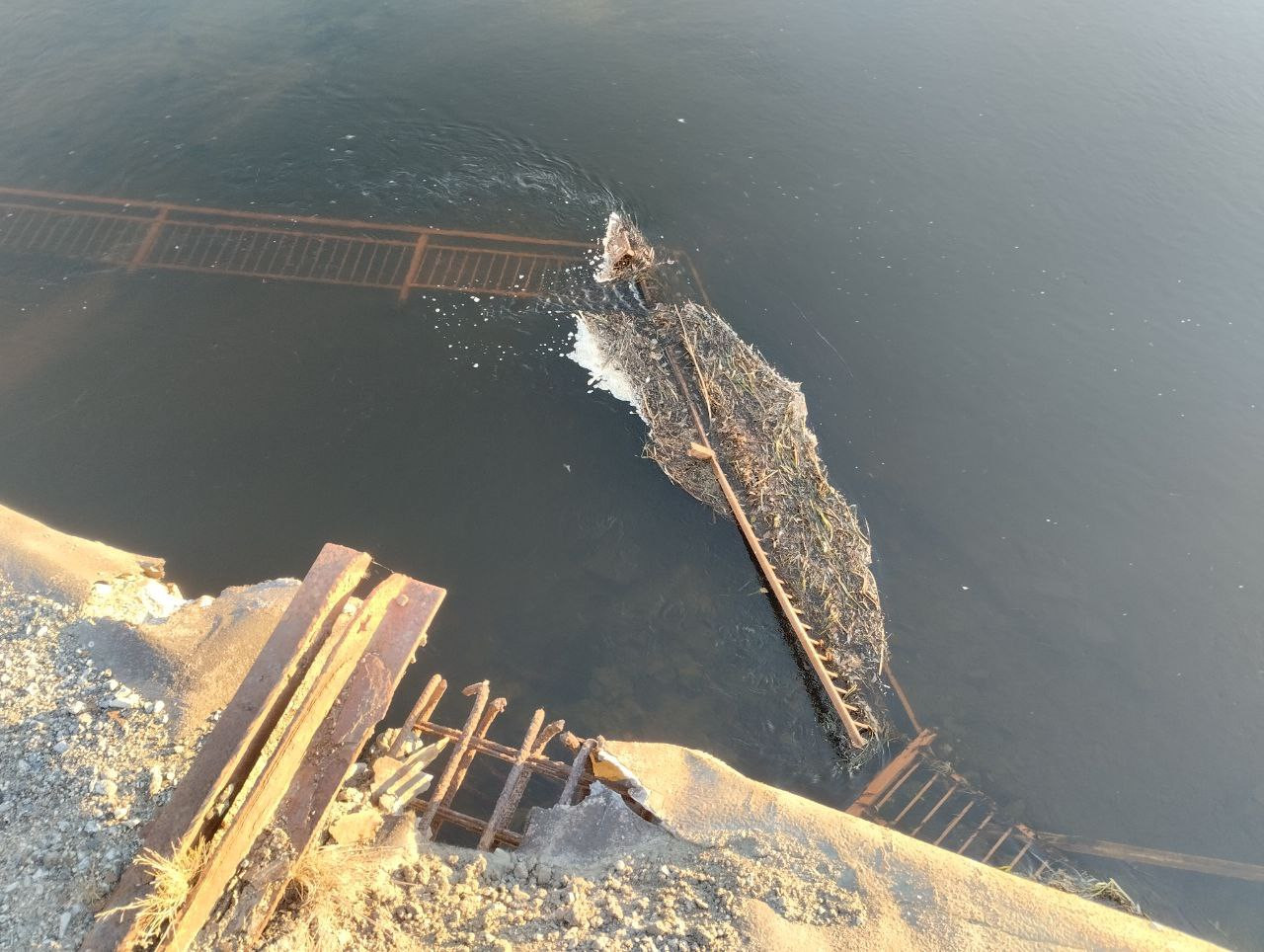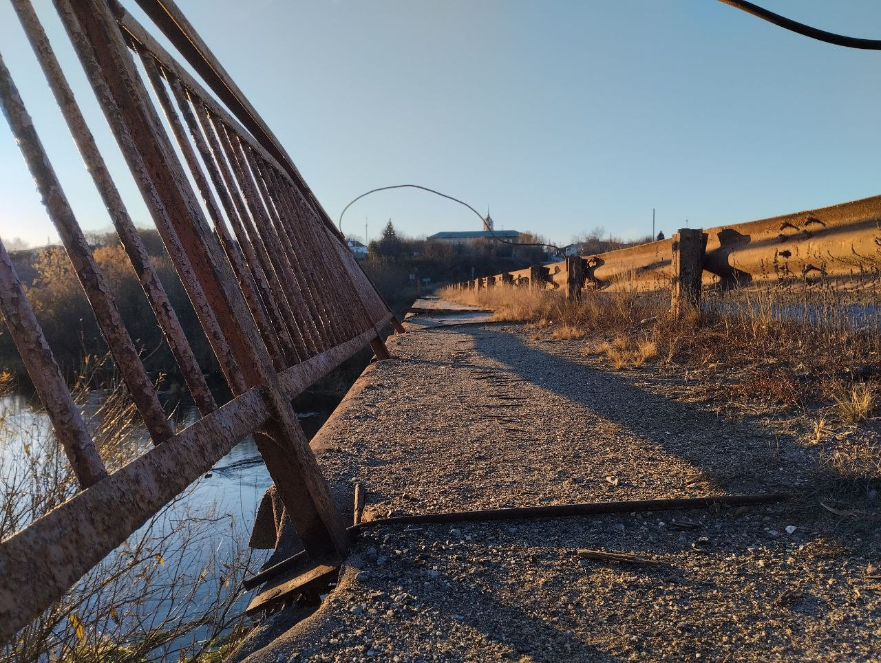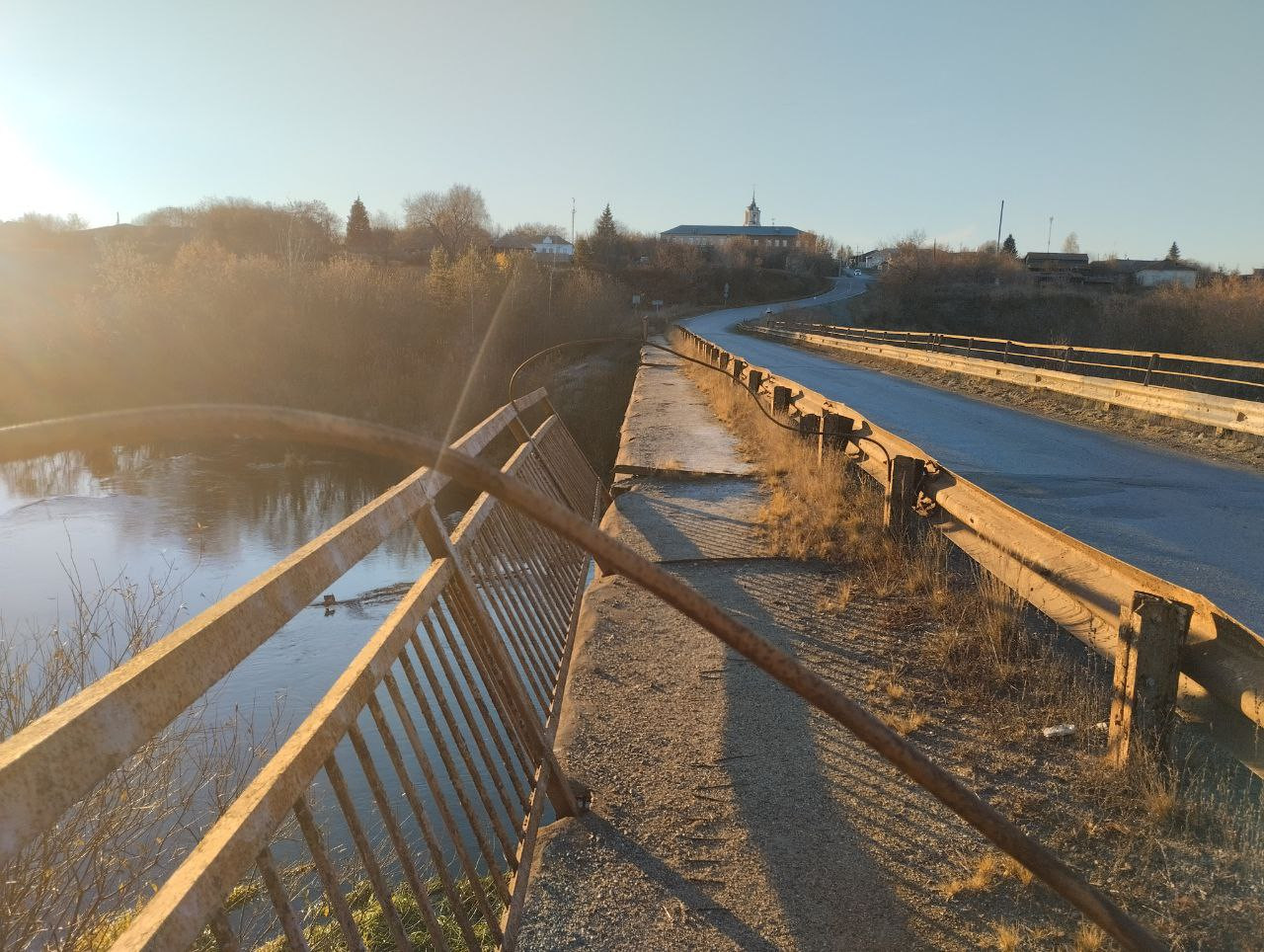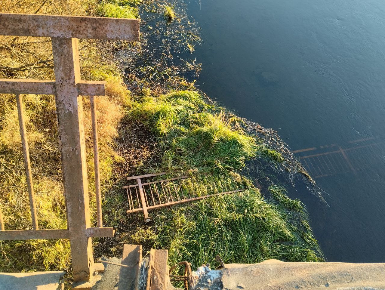 Две недели назад в реку упали металлические перила ограждения пешеходной дорожки. Арматура, на которой они держались, сгнила. Теперь часть пешеходной части моста - без защиты.
