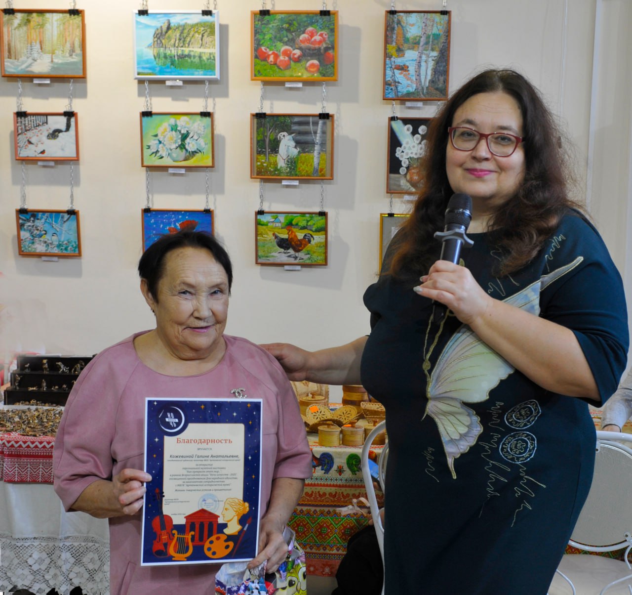 Ольга Николаевна Ячменёва и в этот раз — участница праздника искусств. Ее роскошные шали и платки высшего качества знакомы многим нашим жителям. С помощью этой талантливой вязальщицы было проведено не одно знаковое культурное мероприятие Артемовского. Радовала нас она и литературным творчеством.