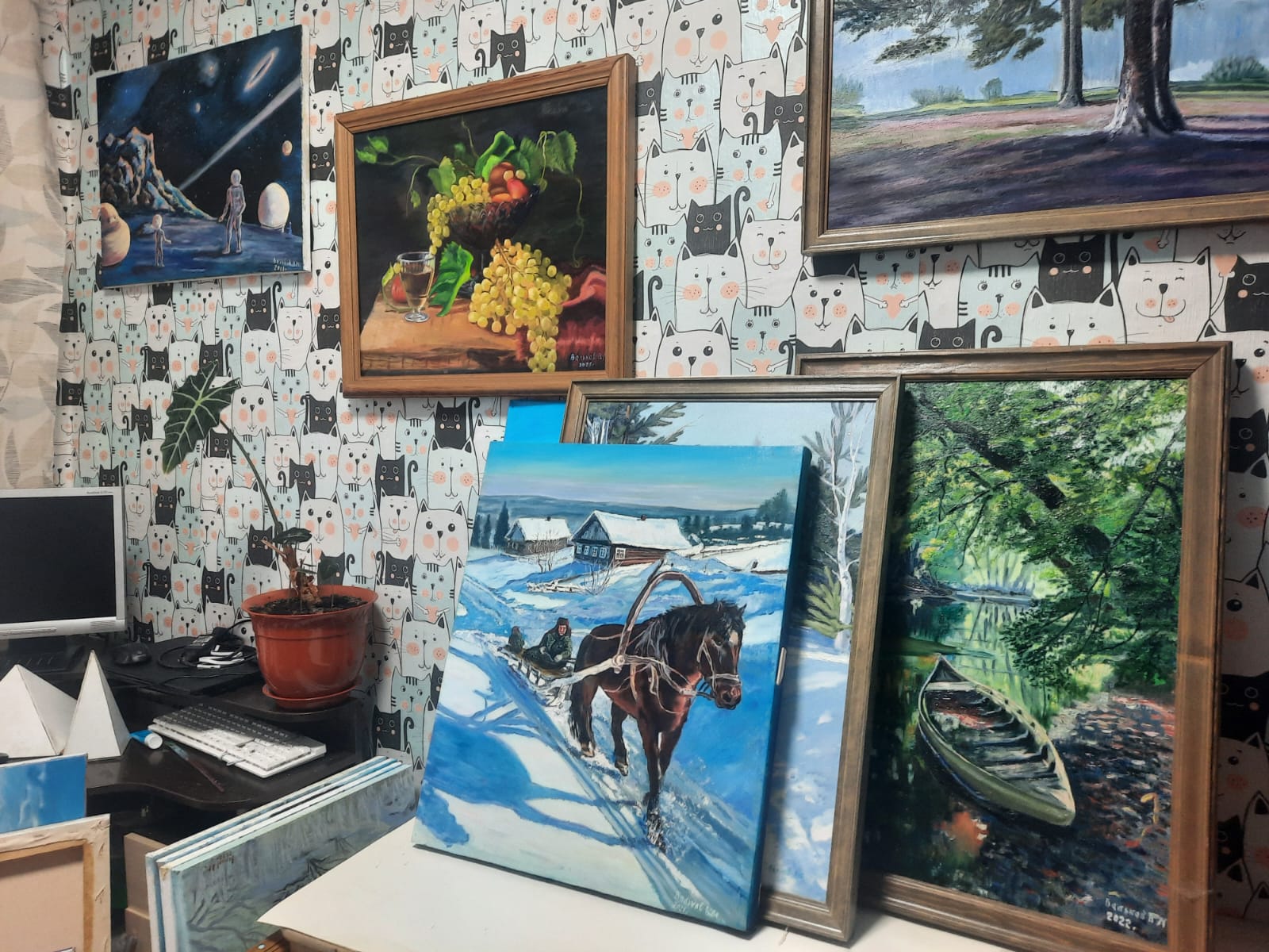 — Сразу стал рисовать нашу природу. У меня много пейзажей с нашей речкой Бобровкой. Места у нас очень красивые. Я вначале фотографирую понравившуюся картинку природы, а потом с фото рисую пейзаж. Работаю масляными красками. Мне нравится, что ими можно подчеркнуть любые оттенки цвета. Много пейзажей нарисовано после поездок на реку Реж. Все, кто видит мои картины, узнают эти места. Некоторые картины я создаю, увидев что-нибудь красивое в интернете. Что-то дорисовываю к ним от себя. Мне нравится вносить что-то свое.