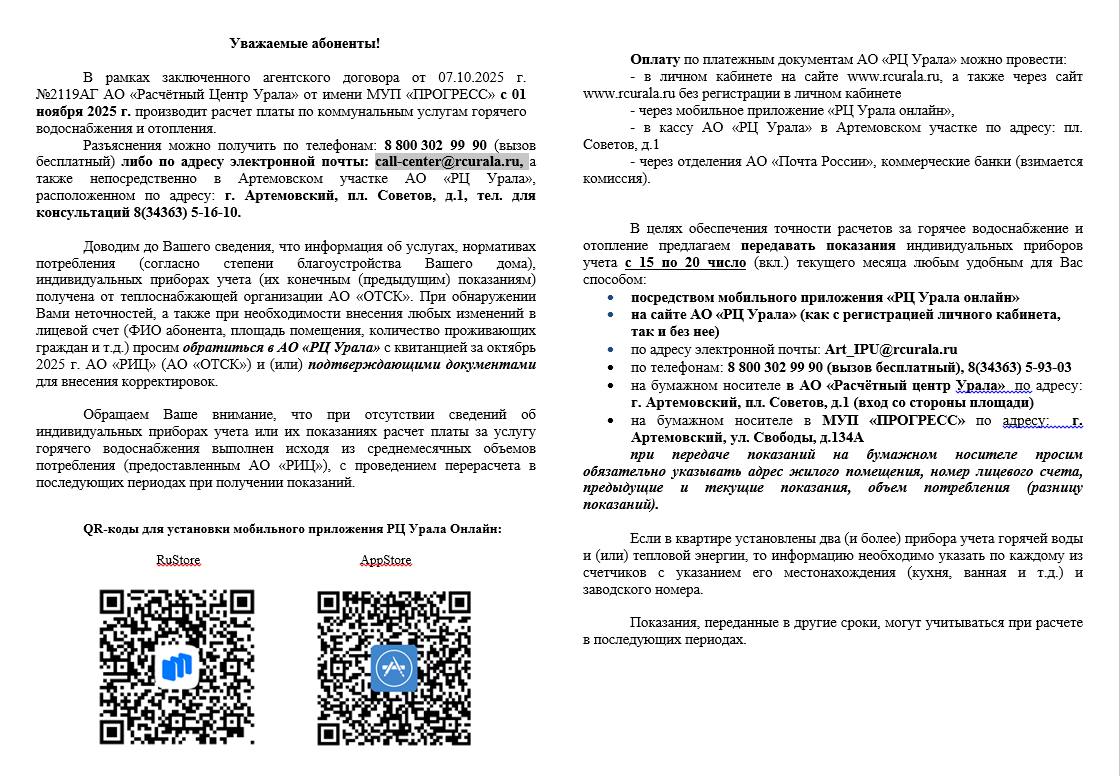 — Расчетный центр Урала в соответствии с агентским договором, заключенным с МУП АГО «Прогресс», с 1 ноября начал свою деятельность по начислению платы за услуги. Они предоставляются МУПом, который являются единым поставщиком тепла и горячей воды на территории Артемовского