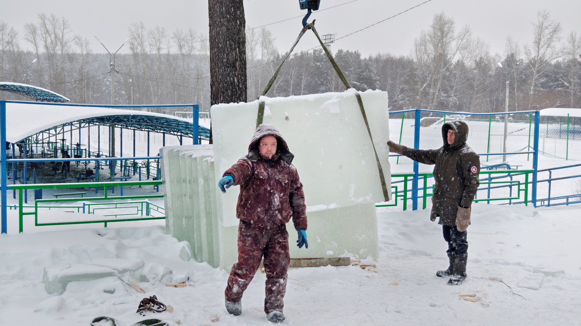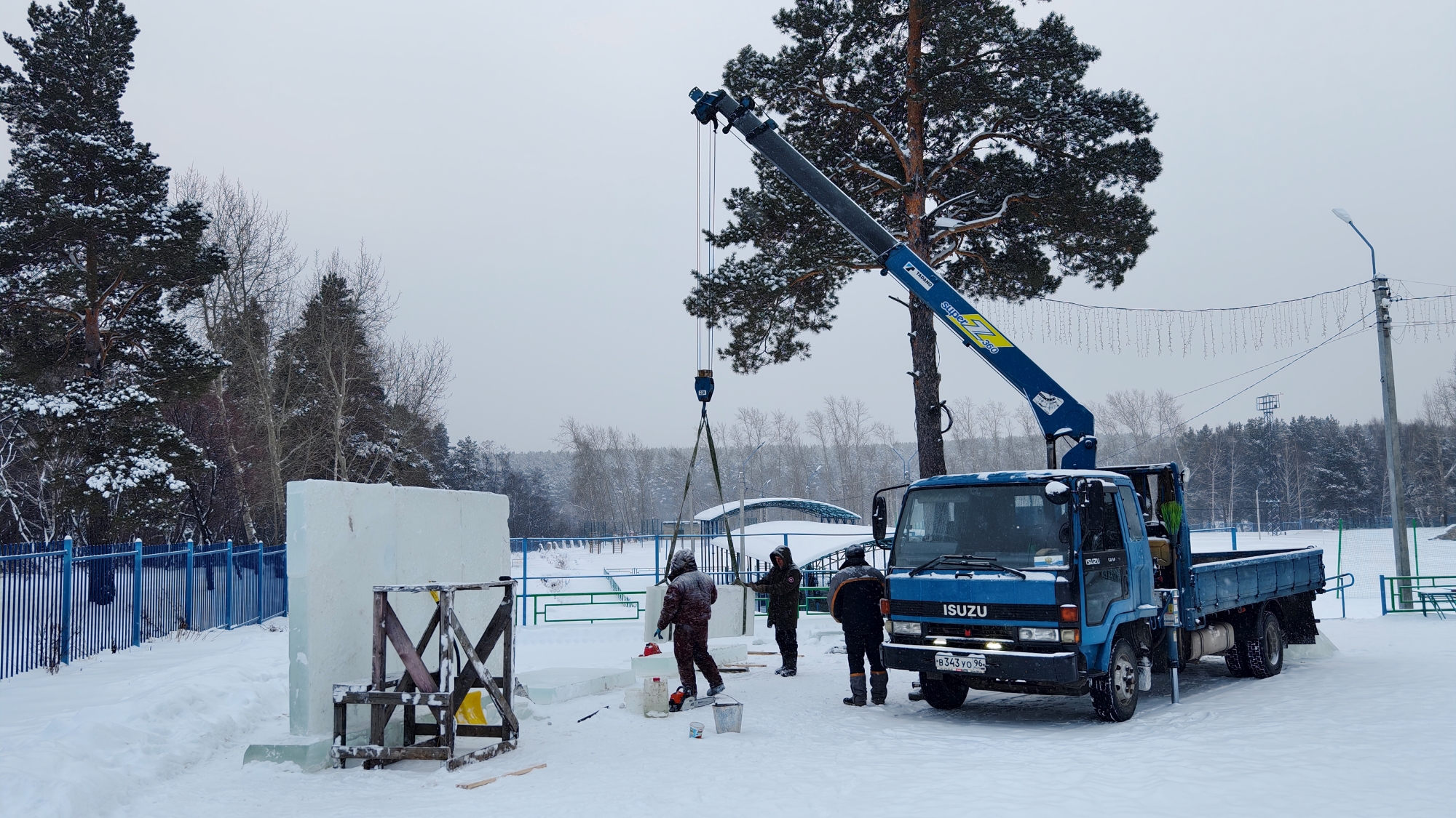 На стадионе «Машиностроитель» идут работы по возведению ледяных скульптур. Для них завезли ледяные кубы.