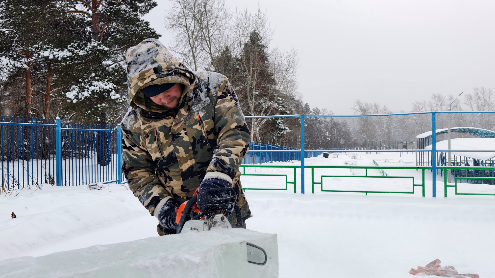 Строительство снежного городка ведет бригада предпринимателя Ильи Богомолова. За всем следит и руководит работой опытный скульптор ледяных дел, признанный мастер зимних скульптур художник Олег Николаевич Клавдеев (на фото справа)