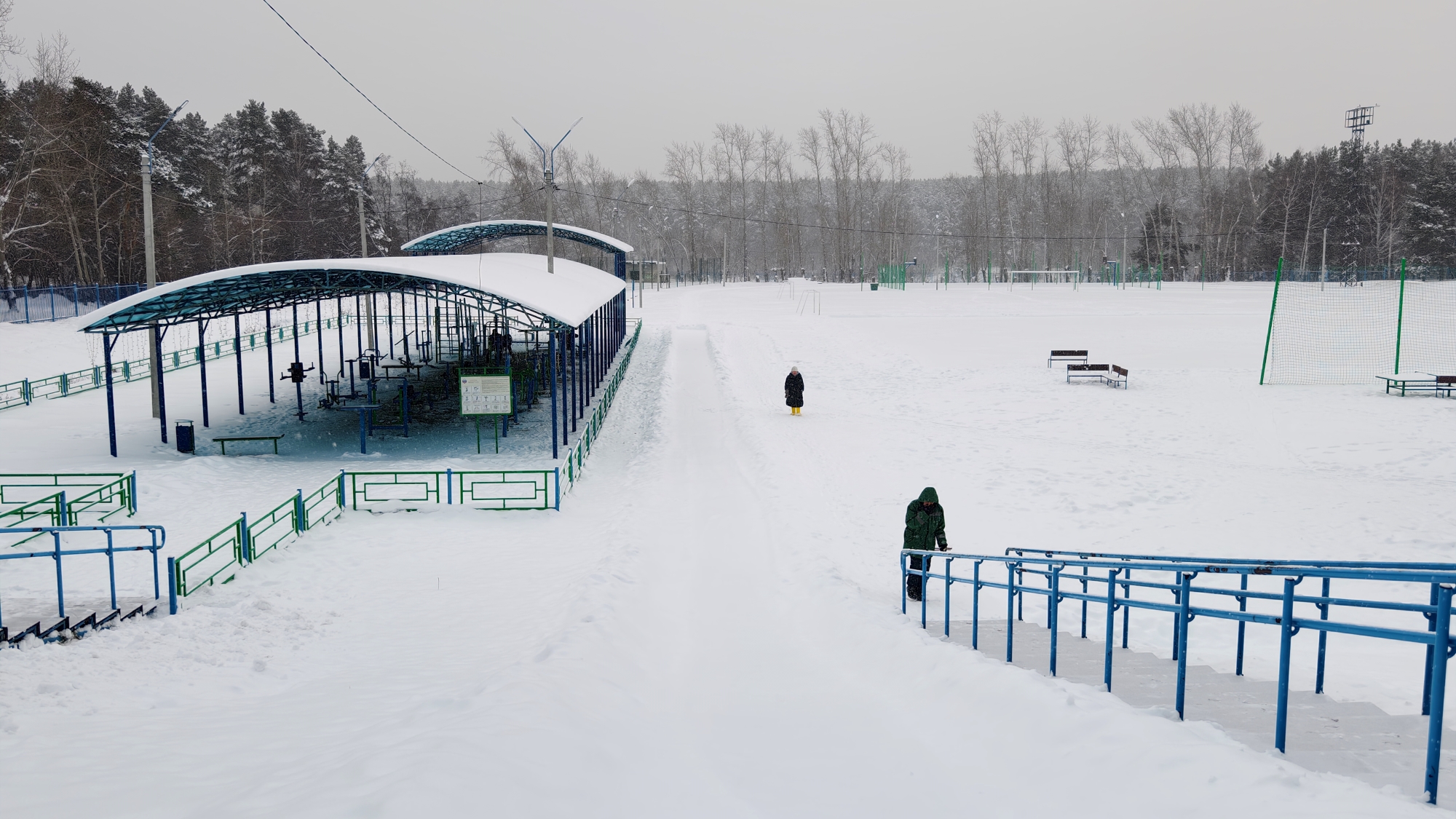 Народ, конечно, ждет на стадионе, большую горку и катки для детей и взрослых. Они есть, но снегопад заметает лед на них.