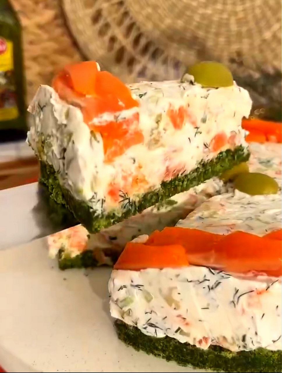 Как готовить. Крекер и шпинат размолоть в блендере до однородной массы. В форму для выпечки выложить смесь и утрамбовать стаканом, чтоб получился корж. Смешать творожный сыр с мелко нарезанными оливками и красной рыбой.