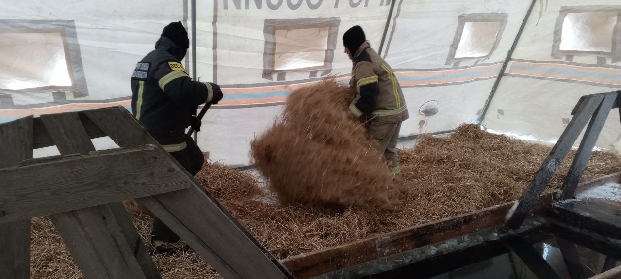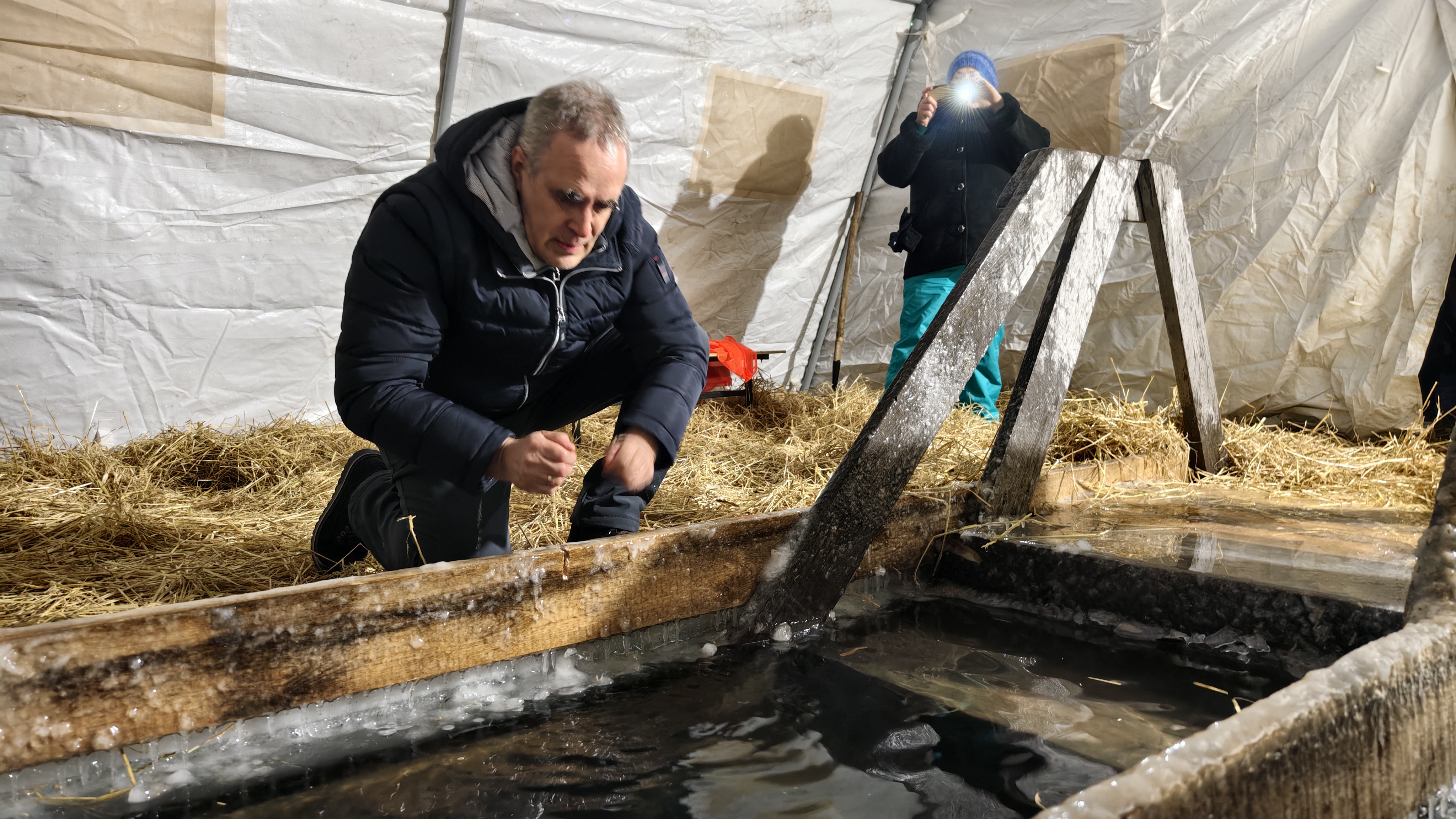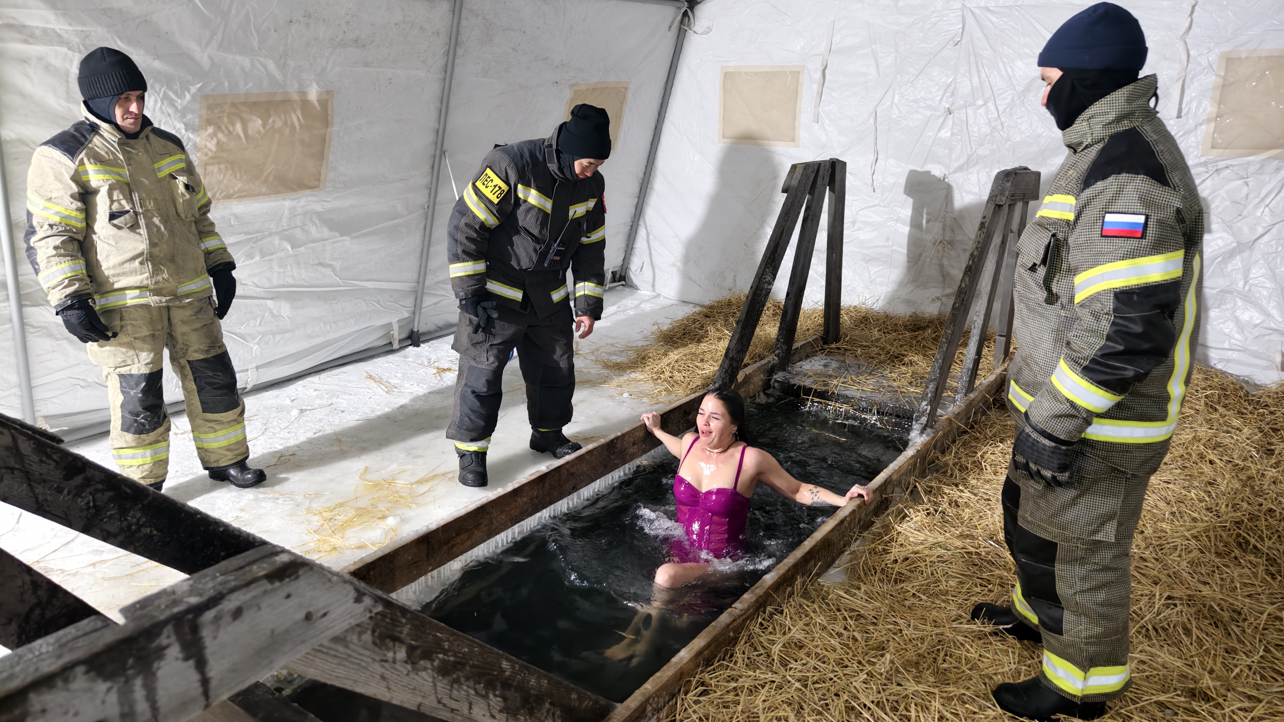Лед на пути к месту омовения и внутри палатки с купелью укрыли соломой, чтобы не скользко были идти желающим окунуться.