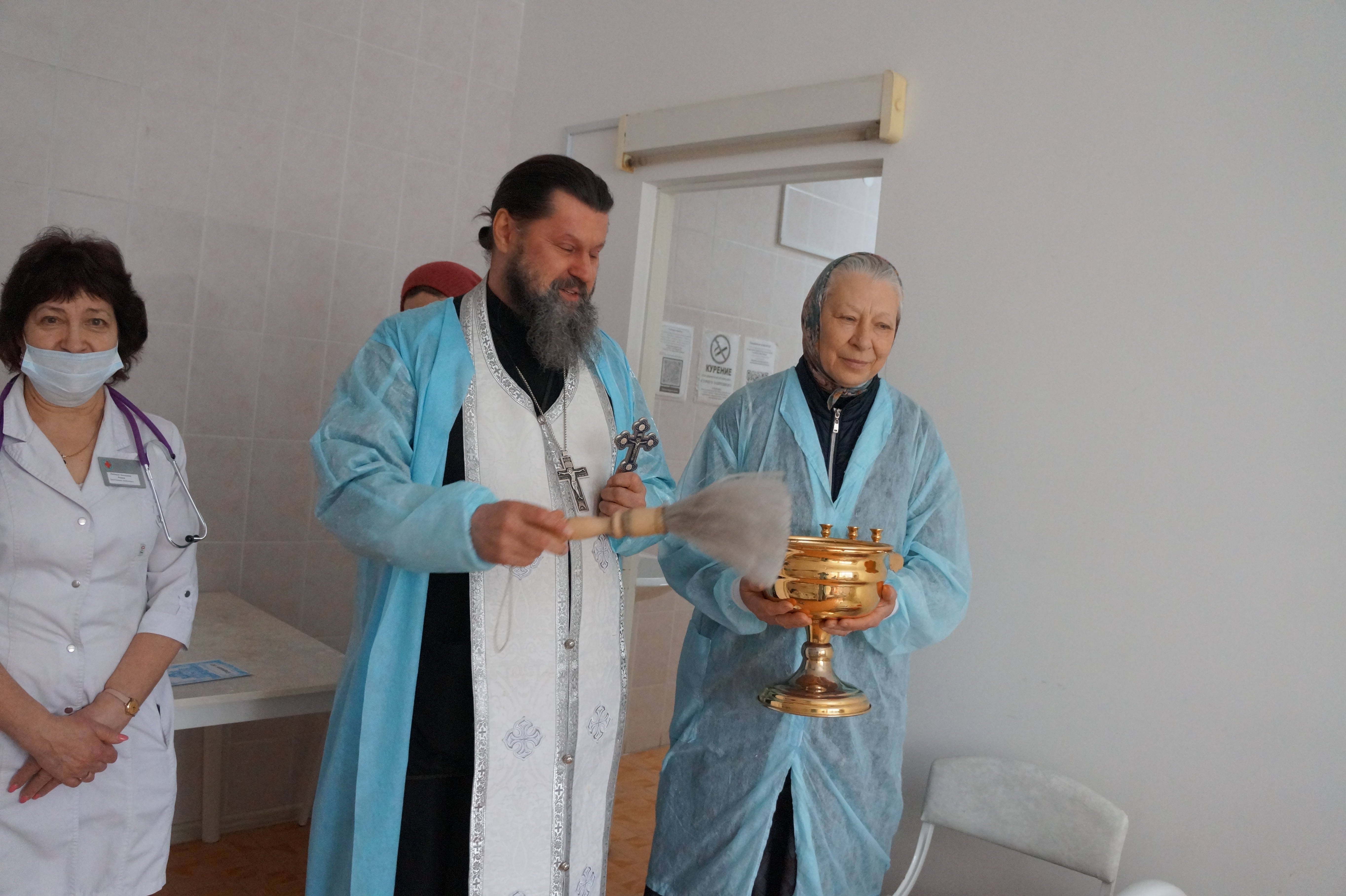 Батюшка окропил святой крещенской водой все палаты отделений, пациентов и медперсонал, а также поздравил всех с праздником Святых Богоявлений.