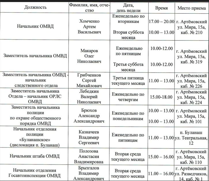 График приема граждан начальником и руководителями в феврале представил отдел МВД России «Артемовский».