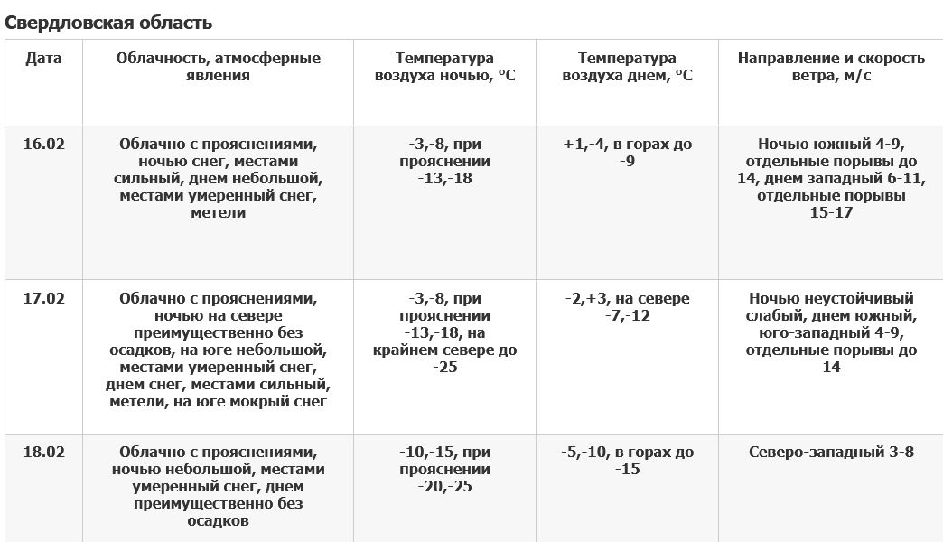 За часы с утра 14 до утра 15 февраля на юге области днем наблюдалась оттепель +0,1,+2,7°, на севере и крайнем юго-западе было 0,-5°. В Екатеринбурге днем было +2,7°, ночью -1,6°.