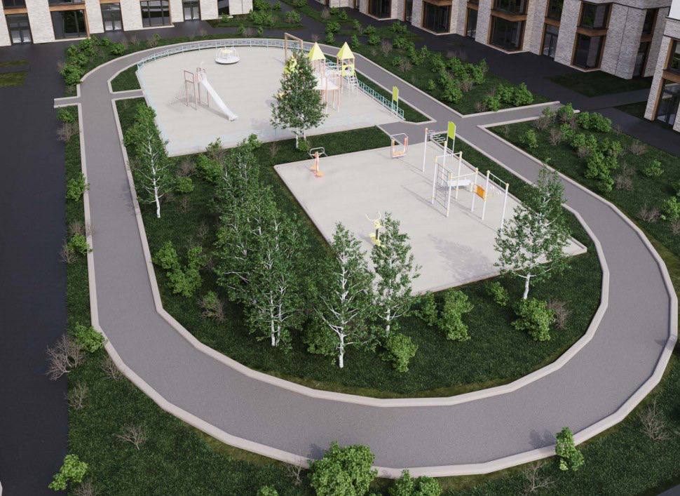 Площадка во дворе займет немалую площадь и будет состоять из двух частей: детской — с качелями, лазалками