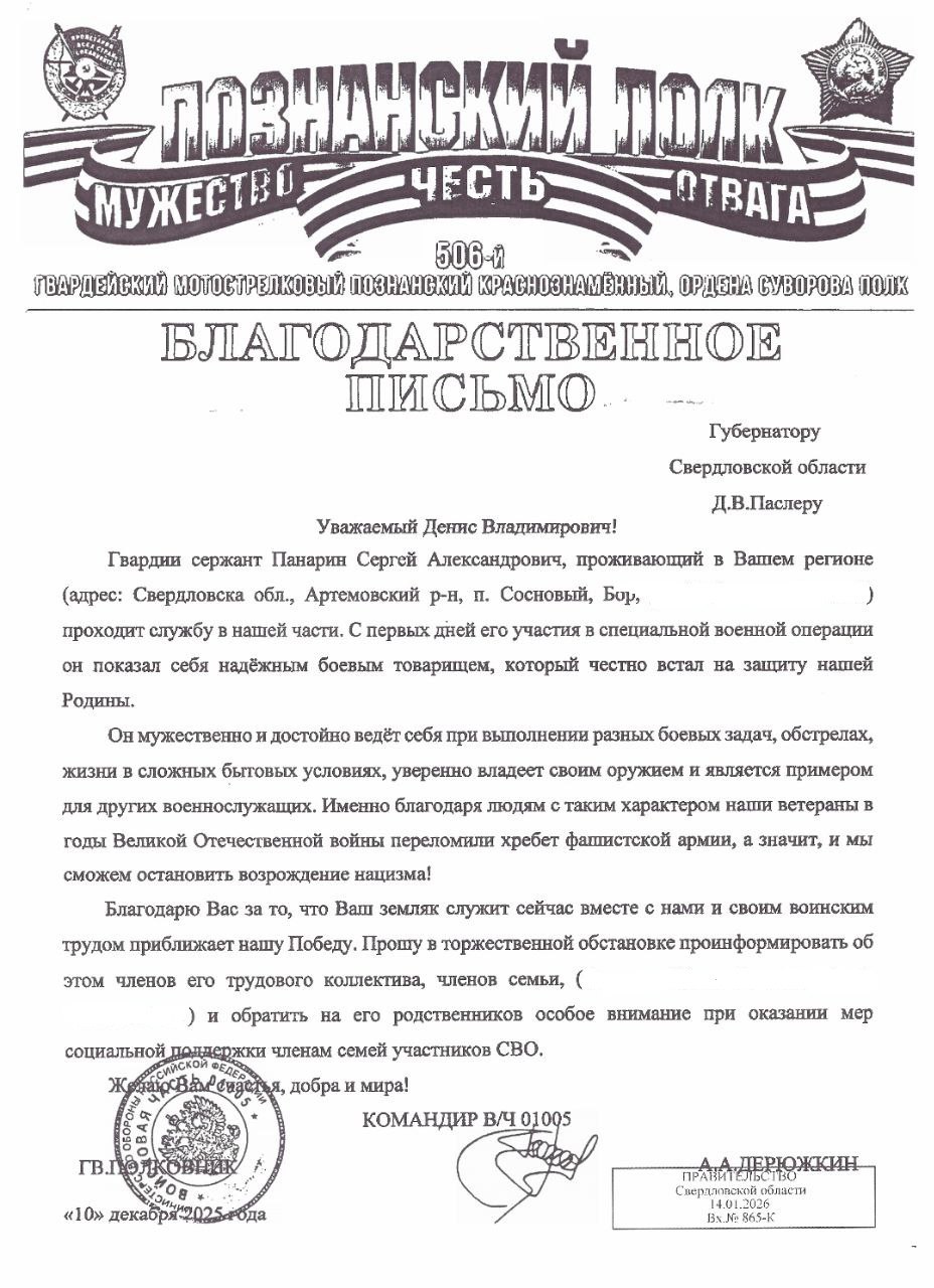 «Гвардии сержант Панарин Сергей Александрович, проживающий в Вашем регионе, проходит службу в нашей части. С первых дней его участие в специальной военной операции он показал себя надежным боевым товарищем, который честно встал на защиту нашей Родины.