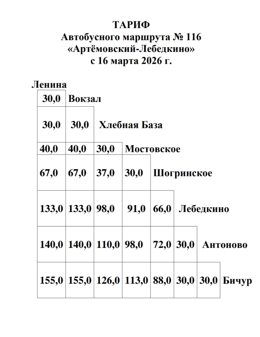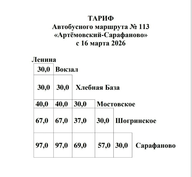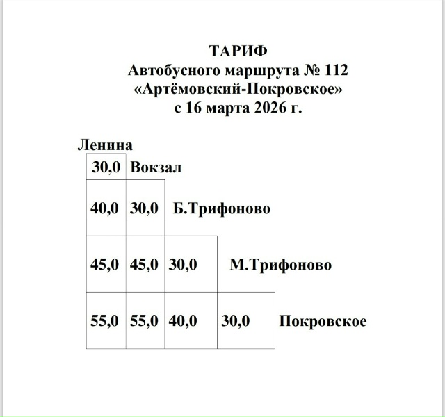 С 15 марта стоимость проезда по маршрутам 111 и 111-А составляет 30 руб. по г. Артемовскому и по п. Буланаш, 40 руб. — от г. Артемовского до п. Буланаш, от п. Буланаш до г. Артемовского.