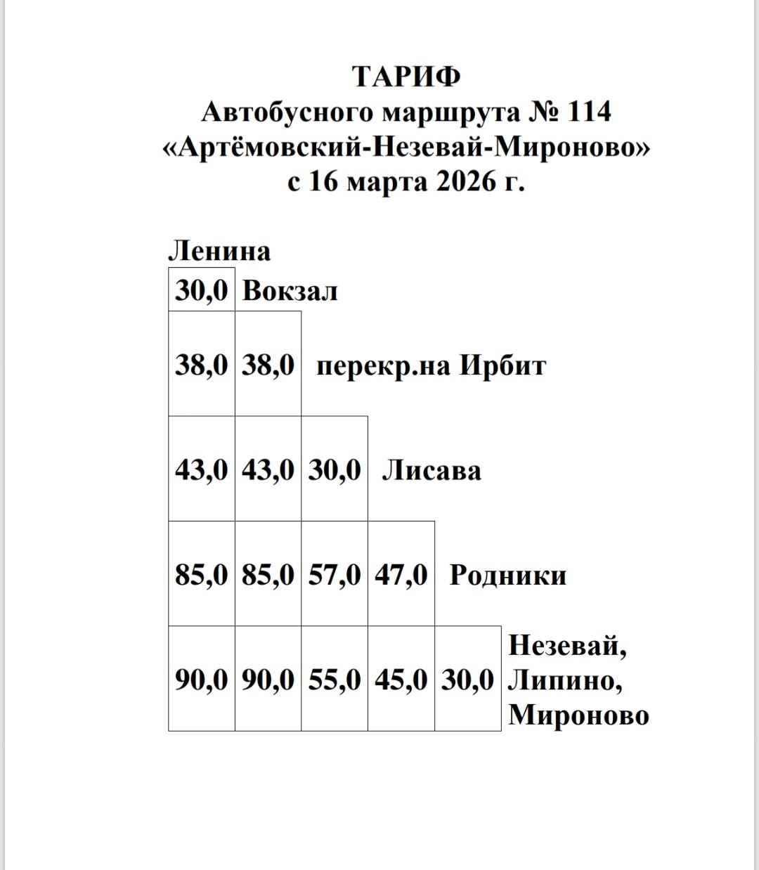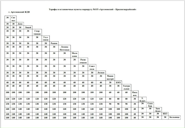 Стоимость проезда на муниципальных маршрутах 112, 113, 114, 115 и 116 в черте г. Артемовского также составит 30 руб., стоимость проезда до иных населенных пунктов по маршрутам следования — на фото ниже.