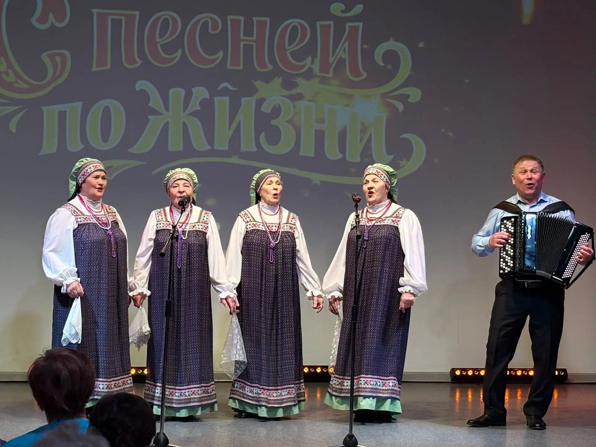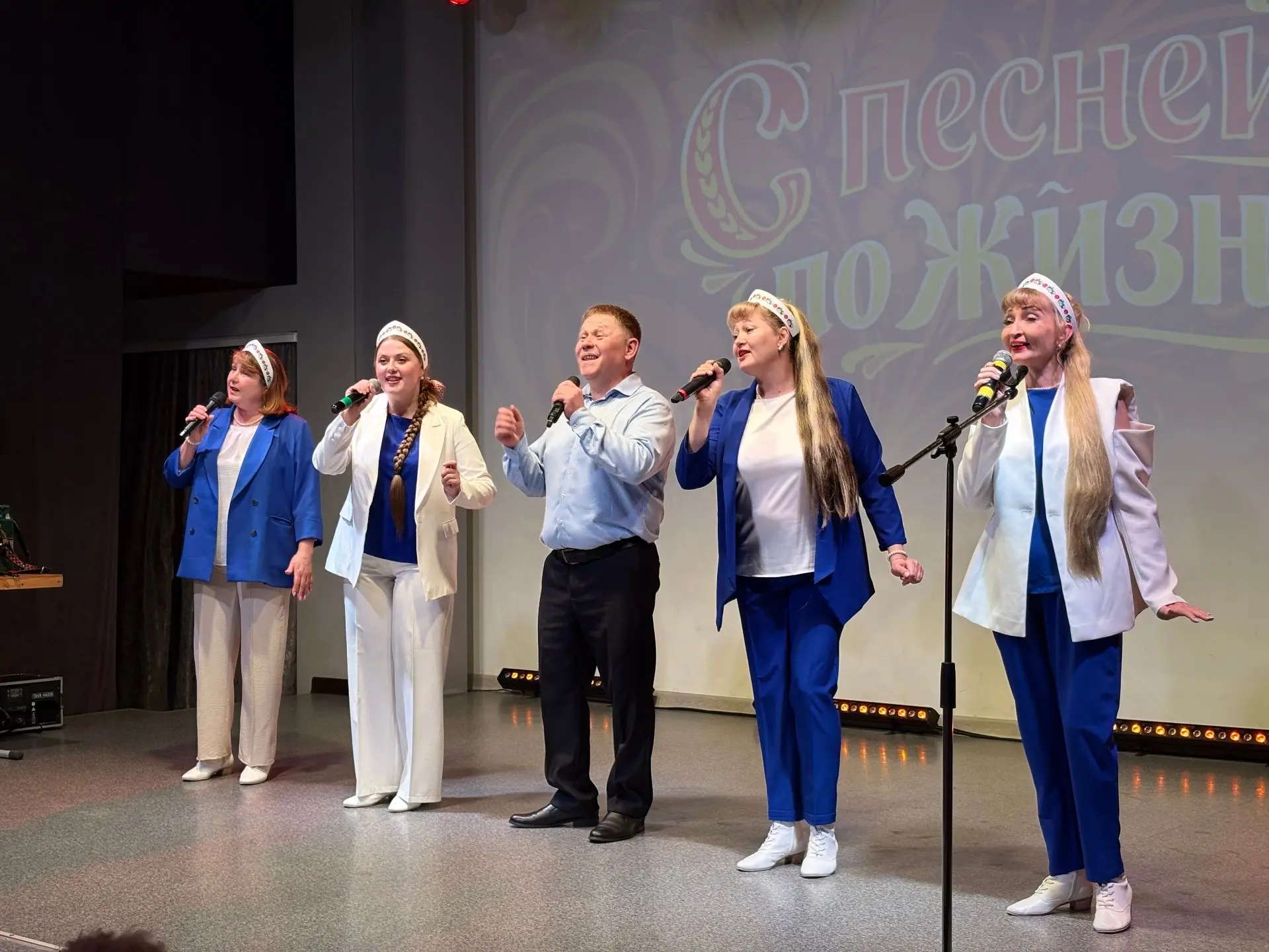 На сцене под руководством мастера выступили сразу три его коллектива — любительский народный хор ветеранов «Рябинушка», ансамбль «Истокские девчата» и трио «Сестры».