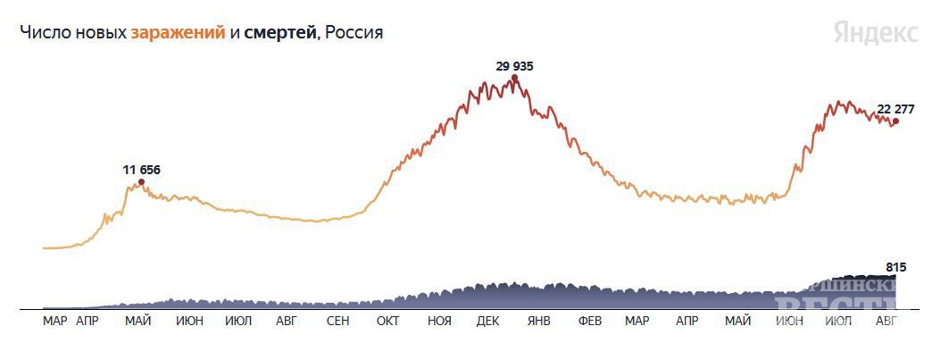 Число летальных исходов возросло на 815, что стало новым максимумом с начала пандемии. Второй день подряд в стране регистрируют более 800 летальных исходов - в четверг штаб сообщил о 808 умерших. Всего с начала пандемии, по его данным, в России умерли 168 864 заболевших.