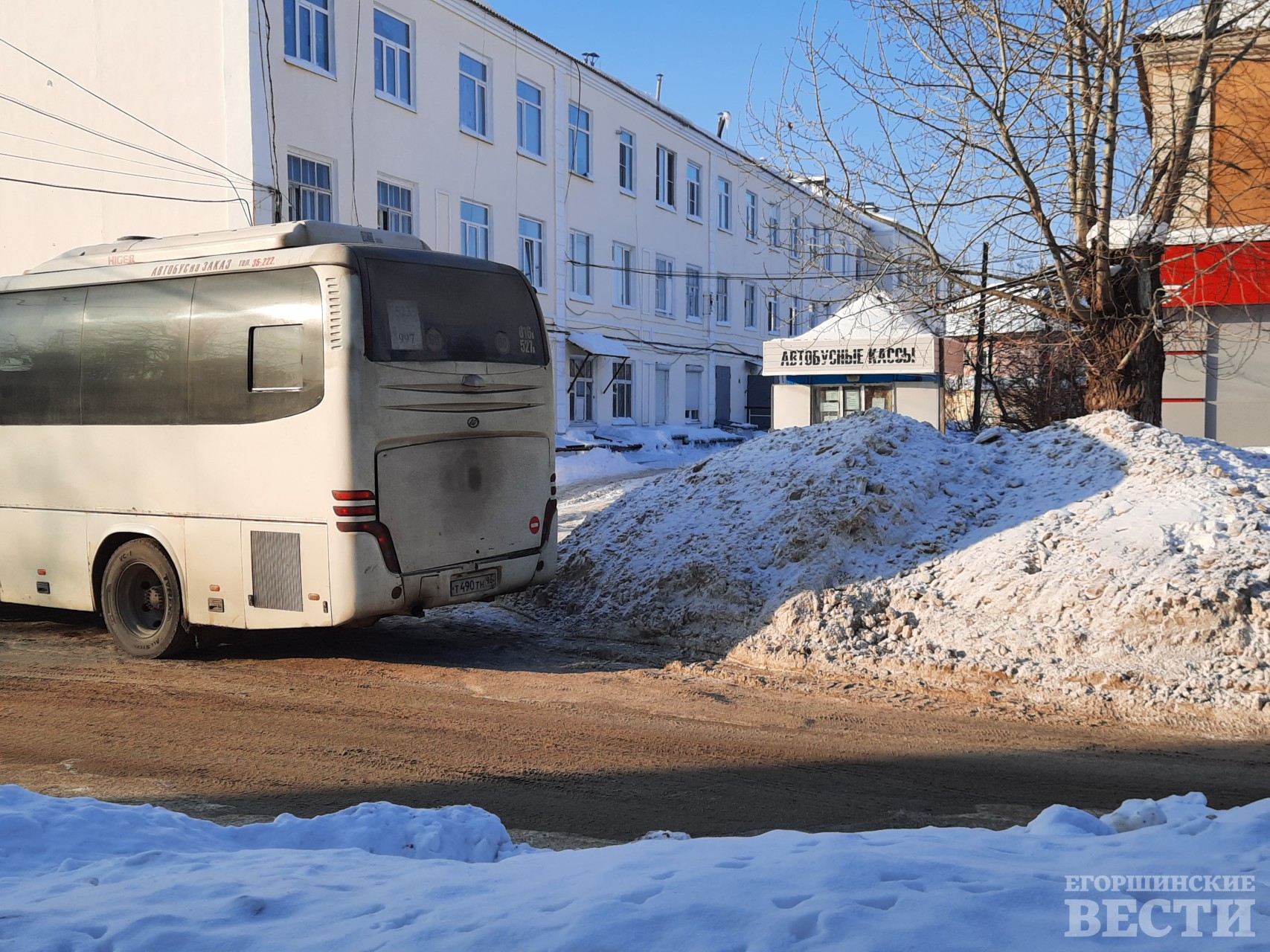 Фото: А это местный «автовокзал», откуда уходят в рейс междугородние автобусы. Сколько нужно мастерства водителям крупногабаритной техники, чтобы развернуться на небольшом пятачке. Виной тому и директора магазинов, сгребающие снег на проезжую часть. Фото: Михаил Дудин, «ЕВ»