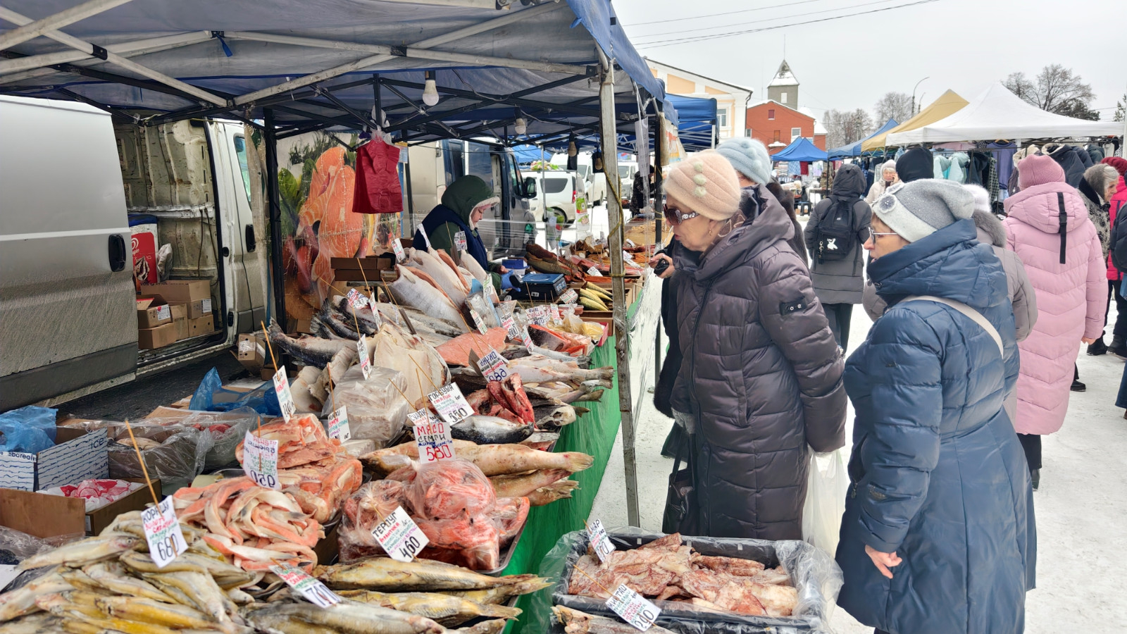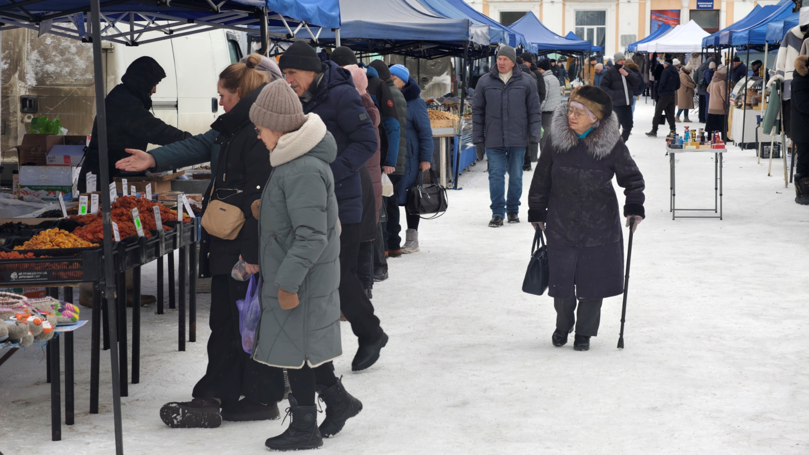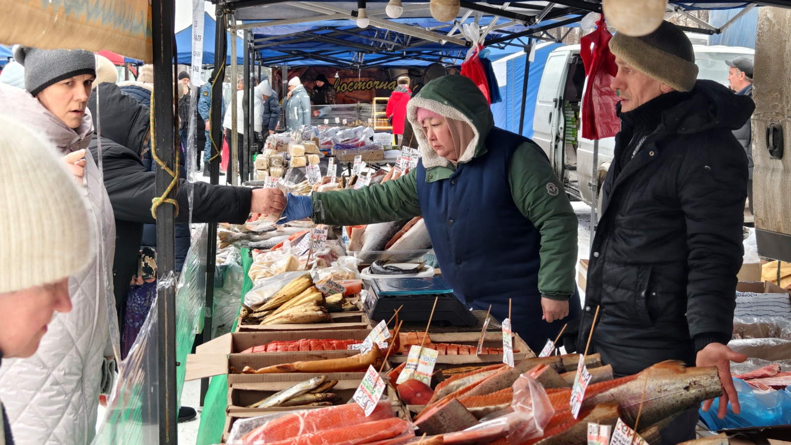 Покупатель на ярмарке разного возраста и достатка. Дамы моложавого вида в норковых шубках выбирают орехи и чай, пенсионерки протирают очки на масло и вареную колбаску, мужчины просят взвесить копченую рыбку не самого благородного происхождения.