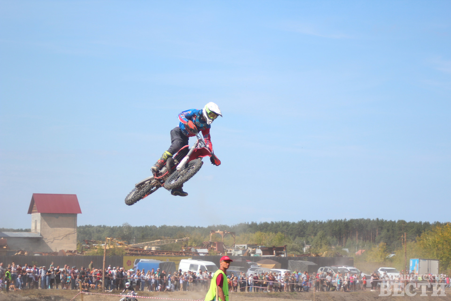 Каменск-Уральский гонщик Арсений Алферьев при проходе трамплинов радовал зрителей необычной, зрелищной техникой исполнения. В этот раз мотоцикл был “положен” набок. Фото: Андрей Москвитин, “ЕВ”