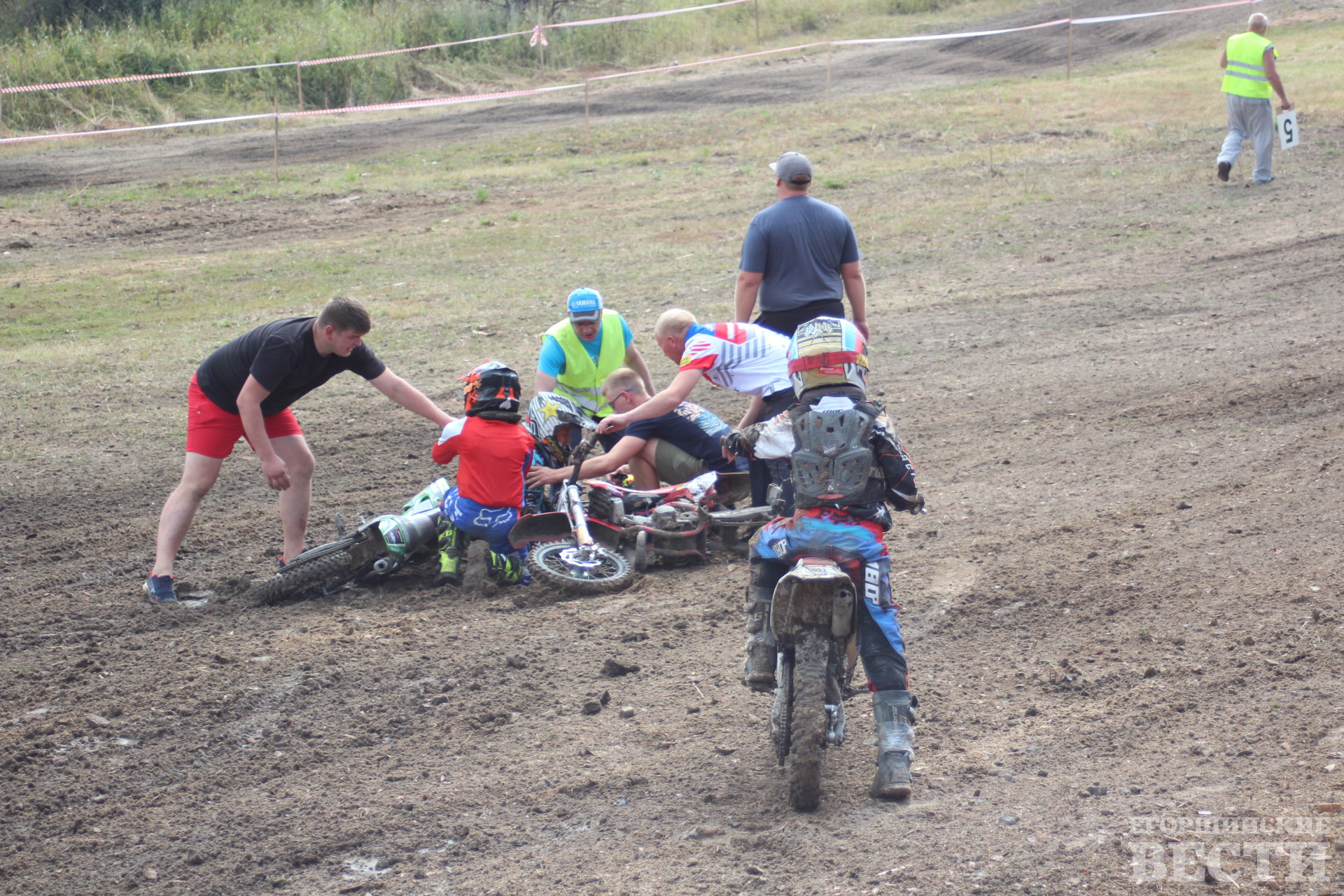 В первом заезде гонщиков класса 65 куб.см. (8-12 лет) прямо на старте произошло столкновение сразу четырех спортсменов. Подоспели даже медики, но к счастью их помощь не понадобилась. Хотя в дальнейшем первый день у них выдался горячим. Травму получил даже главный судья, участвовавший в заездах. Фото: Андрей Москвитин, “ЕВ”