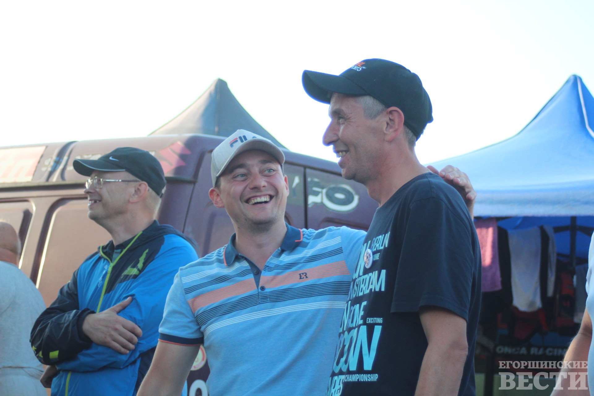 Главный спонсор - исполнительный директор “УСПК” Антон Максимов (в центре), поздравляет организатора соревнований и гонщика Дмитрия Семиохина (справа) с удачным проходом сложной трассы. Два месяца на ее подготовку и 2 дня заездов. У Димы забот хватало. Фото: Андрей Москвитин, “ЕВ”